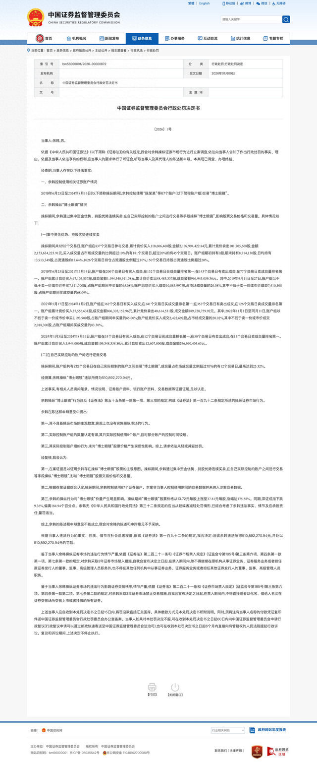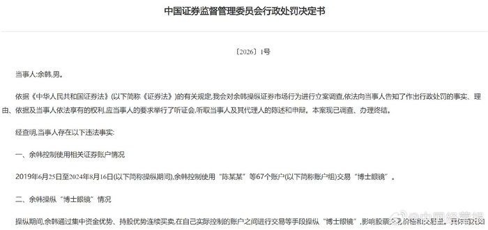 证监会行政处罚 - 中国证监会于2026年1月23日披露2026年1号行政处罚决定书 对当事人余韩操纵证券市场的行为作出处罚 [1] - 处罚决定为没收违法所得510892270.94元 并处以510892270.94元罚款 合计罚没金额达10.22亿元 [1] - 鉴于违法行为情节严重 证监会对余韩采取3年证券市场禁入措施 [1] 操纵行为细节 - 操纵行为发生于2019年6月25日至2024年8月16日期间 持续时间超过5年 [1] - 余韩控制使用了67个证券账户交易“博士眼镜”股票 [1] - 操纵手段包括集中资金优势、持股优势连续买卖 以及在自己实际控制的账户之间进行交易 [1] - 上述行为影响了“博士眼镜”股票的交易价格和交易量 [1] - 经测算 余韩操纵“博士眼镜”的违法所得为510892270.94元 [1]