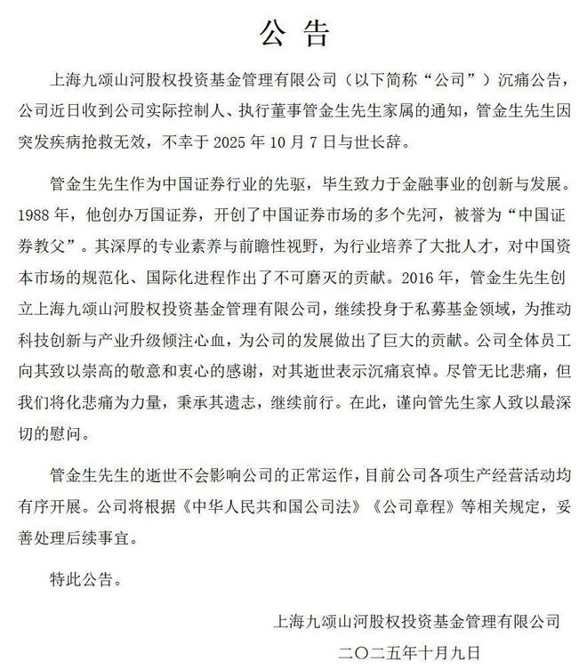 10月9日深夜11点,上海九颂山河股权投资基金管理有限公司(以下简称九颂基金)发布公告称,公司 实际控制人、执行董事管金生先生家属的通知,管金生先生因突发疾病抢救无效,不幸于2025年10月7 日与世长辞。 回顾中国A股激荡起伏的三十年历史,管金生是一个绕不开的名字。他曾是上海滩上的"证券教父",一 手创办新中国首家证券公司万国证券,后因 "327国债事件",一夜之间从巅峰跌落谷底。 从寒门学子到"中国证券业教父" 公开信息显示,管金生,1947年5月19日出生于江西省清江县(现樟树市),1965年考入上海外国语学 院法语系,后赴比利时布鲁塞尔自由大学深造,获法学、工商管理双硕士学位。 1988年2月,管金生负责筹建上海第一家证券公司——万国证券,由上海国际信托投资公司等10家股东 筹资3500万元人民币,管金生任副董事长、总经理、总裁。 1990年11月26日,上海证券交易所宣布成立,管金生全盘设计了上海证券交易所的交易规则、设备到交 易员培训的全体系建设,深沪两地的异地交易首先由万国证券开通;无纸化交易也由万国证券率先推 动。 因"327国债事件"曾获刑17年 69岁再创业 鼎盛时期,万国证券持有所有国内 ...