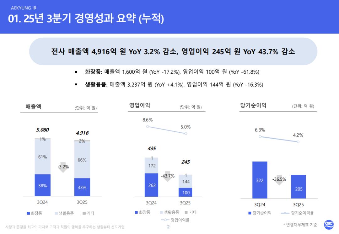 因陷财务危机,"卖子求生"的爱敬,如今发展境况如何? 在昨日(11月4日)发布的三季报中,韩国上市公司爱敬产业(Aekyung Industrial,001740.KRX)在1-9月、Q3的美容业务营业收入、营业利润均呈双降,其中 1-9月营业利润更是暴跌61.8%,Q3亦大幅下降45.8%,可见,其发展形势不容乐观。 细分拆解爱敬财务数据,其在今年前三季度整体营业收入为4916亿韩元(约合人民币24.33亿元),同比下降3.2%;营业利润为245亿韩元(约合人民币1.21亿 元),同比大跌43.7%。 △截图自爱敬三季报 上述财务数据也揭示了一个不争的事实,爱敬整体业绩疲软,加之美容业务也面临下滑困境,存在缺乏增长动能、难以贡献有效利润支撑等难点,或许会 让这一昔日韩妆巨头,因整体盈利能力的下滑与美妆业务的拖累形成叠加效应,继而深陷经营困局。 腰斩!美容业务营业利润跌超60% 进一步拆解爱敬三季报,需要注意的是,其在Q3单季业绩上营收呈现增长,为本次主要业绩数据中少见的增长,但利润却呈双位数下滑。 据财报显示,爱敬Q3营收为1693亿韩元(约合人民币8.38亿元),同比增长2.4%;营业利润73亿韩元(约合 ...
