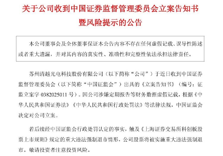 上市不满3年 清越科技涉嫌财务数据虚假记载被立案