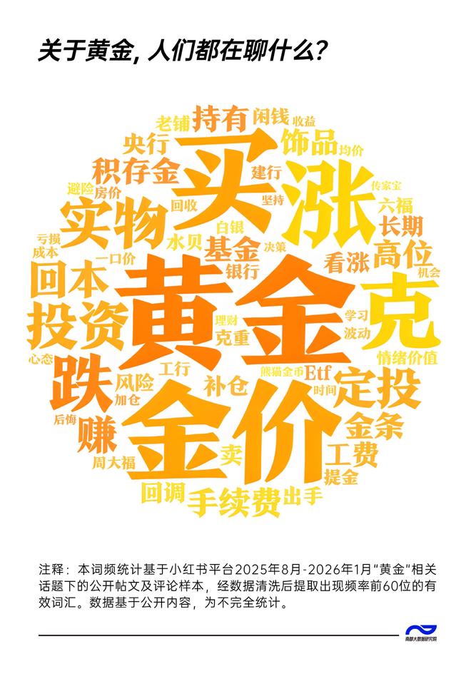 文章核心观点 - 黄金价格在过去十年经历了显著的价值重估,从每克不足250元人民币上涨至突破千元大关,近两年的急速攀升反映了全球格局动荡与普遍的财富焦虑 [1] - 黄金消费观念正发生结构性变迁,从传统的投机或消费行为,演变为融合了长期价值投资、文化审美与情感寄托的复合体验,年轻一代成为推动此变革的重要力量 [2][3] - 社交媒体成为观察黄金消费心理与市场情绪的关键场域,它既是信息交换和投资教育的平台,也提供了情绪共鸣与集体疗愈,降低了黄金投资的信息门槛 [2][10] 黄金价格与市场背景 - 黄金价格在十年间从每克不足250元人民币飙升至突破千元大关,曲线背后是一场持续十年的价值重估 [1] - 近两年的金价急速攀升,映射了全球格局的动荡与重组,也照见了社会面临的财富焦虑 [1] 消费群体与观念变迁 - 年轻消费者正将黄金纳入纪律性的长期理财规划,“定投”、“闲钱”、“长期”、“积存金”成为高频关联词,他们视黄金为“慢财富”和资产配置工具 [3][6] - 大学生案例显示,其从2023年8月金价400多元时开始定投,目前持有超一公斤黄金,计划持有五年以上,将涨跌均视为机会,表现出理性长期持有的心态 [7] - 40岁的投资者案例显示,其基于矿业工程背景在2013年金价300多元(低于开采成本)时购入,并在金价涨超700元时部分获利了结,严格区分投资与消费目的 [8] - 黄金消费从单一商品交易演变为融合价值投资、文化与审美的复合体验,消费者既追求性价比(如关注“水贝”、“克单价”),也愿为工艺和IP支付溢价 [8] 消费动机与心理诉求 - 黄金消费动机呈现多元分层,“资产配置”、“避险”与“情绪价值”、“传家宝”等词并列高频出现 [8] - 部分消费者将黄金视为对抗经济不确定性的现实锚点,认为其能提供股市无法给予的安稳感 [9] - 黄金对年轻人而言成为情绪管理工具,例如在“上班不爽”或失恋时购买,实现了“花钱解压还盈利”或情感物质化的转换 [9] - 黄金超越了金融属性,成为连接实用主义安全感与精神慰藉的独特介质 [9] 投资行为与市场情绪 - 社交媒体词频分析显示,“涨”与“跌”是紧随“黄金”与“买”之后的核心情绪词,勾勒出市场情绪的反复拉扯 [2] - 高位波动导致投资者情绪如“过山车”,有用户在高点买入积存金后遭遇大跌,经历严重的焦虑与懊悔,是“小白”式追涨杀跌的缩影 [10] - 投资动因相关词频包括“看涨”、“赚”、“避险”、“机会”,而市场残酷面则体现为“回本”、“后悔”、“波动”、“回撤”、“亏损”等词 [10] 社交媒体角色与信息生态 - 社交媒体成为黄金投资的信息交换站和情绪避难所,用户在此询问购买时机、工费,分享验金视频和提金流程,并建立群组交流数据与分析 [10] - 投资者通过开设社交媒体账号记录心得、分享分析,吸引了大量交流,形成了互助网络,老手传授技巧,小白分享教训,理性派与感性派共存 [10][11] - 在算法推送与话题聚合下,分散的个体经验被连接成一张互助网络,提供了集体疗愈,降低了黄金投资的信息门槛 [11] 行业与产品偏好 - 词频分析显示,“实物”的出现频率远超“ETF”和“基金”,普通消费者更青睐看得见、摸得着的实体黄金 [7] - 消费者购买渠道多元化,“水贝”(深圳黄金产业带)与“周大福”、“老铺”等品牌并列高频出现,“银行”也成为购买金条、金豆的重要场所 [8]