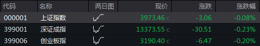 | HSTECH | 恒生科技 | NY ક | 5911.07 c | -11.41 | -0.19% | | --- | --- | --- | --- | --- | --- | | HSI | 恒生指数 | SW 3 | 26148.07 c | -10.29 | -0.04% | 盘面上,油气、AI应用、有色金属板块跌幅靠前,半导体、算力硬件概念股走强。 | 代码 | 名称 | 两日图 | 现价 | 涨跌 | 涨跌幅 | | --- | --- | --- | --- | --- | --- | | 000001 | 上证指数 | 1 W | 3973.46 c | -3.06 | -0.08% | | 399001 | 深证成指 | 5 HW | 13373.55 c | -30.51 | -0.23% | | 399006 | 创业板指 | s W | 3190.40 c | -6.47 | -0.20% | 盘面上,海南自贸区板块延续涨势,燃气、房地产板块小幅上涨;贵金属板块领跌,财税数字化、量子 科技概念跌幅居前。 09:22 港股开盘丨恒生指数低开0.04% 恒生指数低开0.04%,恒生科 ...
