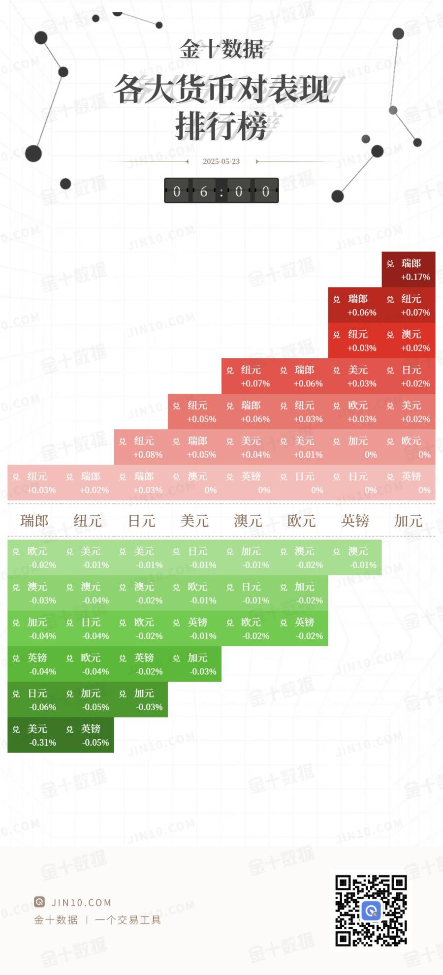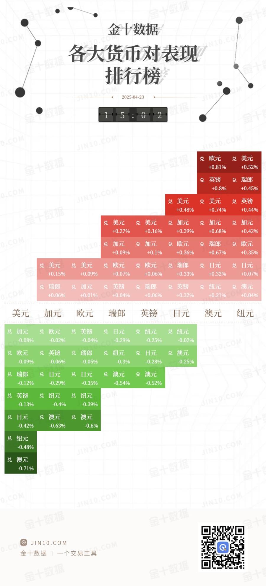 | -0.12% | -0.35% | -0.29% | | -0.54% | -0.52% | | --- | --- | --- | --- | --- | --- | | 栄 | 英镑 | 兑 纽元 | 兑 纽元 | | | | -0.13% | | -0.4% | -0.39% | | | | | 兑 日元 兑 澳元 兑 澳元 | | | | | | -0.42% | -0.6% | -0.63% | | | | | 兑 纽元 | | | | | | | -0.48% | | | | | | | 兑 澳元 | | | | | | | -0.71% | | | | | | | | @ JIN10.COM 金十数据 一个交易工具 | | | | | 金十图示:2025年04月23日(周三)各大货币对表现 ...