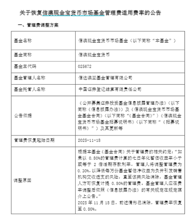 21世纪经济报道记者 黎雨辰 | 基金名称 | 信澳现金宝货币市场基金(以下简称"本基金") | | --- | --- | | 基金简称 | 信澳现金宝货币 | | 基金主代码 | 025672 | | 基金管理人名称 | 信达澳亚基金管理有限公司 | | 基金托管人名称 | 可以世刻監师媒探记·湖米片团中 | | | 《公开募集证券投资基金信息披露管理办法》(以下 | | | 简称《信息披露办法》)及《信澳现金宝货币市场基 | | 公告依据 | 金基金合同》(以下简称"《基金合同》")《信澳现金 | | | 宝货币市场基金招募说明书》(以下简称"《招募说 | | | 明书》")及其更新等 | | 管理费恢复起始日期 | 2025-11-18 | | | 根据本基金《基金合同》关于管理费的相关约定:"如 果以 0.80%的管理费计算的七日年化暂估收益率小于 | | | 或等于 2 倍活期存款利率,管理人将调整管理费为 | | | 0.30%,以降低每万份基金暂估净收益为负并引发销售 | | | 机构交收透支的风险,直至该类风险消除,基金管理 | | 调整原因 | 人方可恢复计提 0.80%的管理费。基金管理 ...
