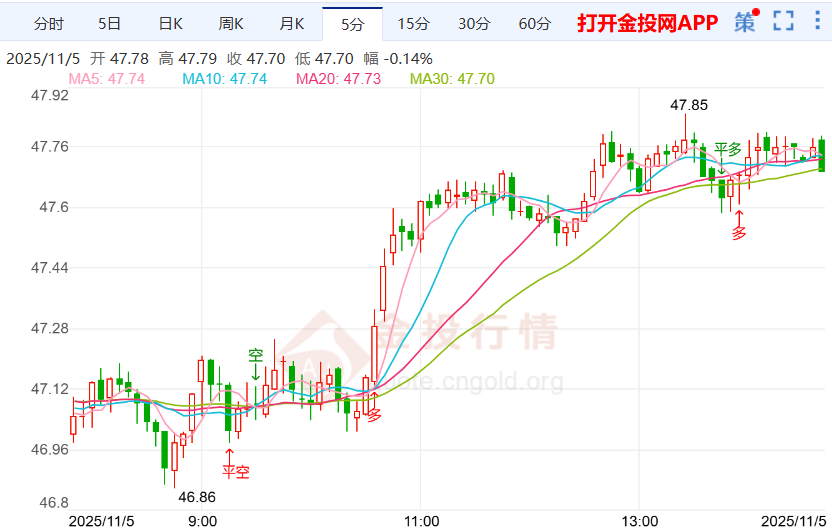 【要闻速递】 美国政府财政停摆已进入第36天,这一时长与2019年纪录持平,有望成为美国历史上最长的停摆事件。 今日周三(11月5日)欧盘时段,国际白银目前交投于47.65一线上方,今日开盘于47.17美元/盎司,截至发稿,国际白银 暂报47.72美元/盎司,上涨1.25%,最高触及47.85美元/盎司,最低下探46.86美元/盎司,目前来看,国际白银盘内短线 偏向震荡走势。 国际白银周二同步走出了下跌,不过收盘还是在47.2附近,目前这个走势来看,白银也可能在47附近尝试性做多看反 弹空间,虽然暂时是弱势,但如果今天反弹走出力度的话,上方站稳48的话,也有可能会出现强势反弹的延续性,所 以,今天白银先观察一下,看是否站稳48之上,站稳48,再看49.5高点,这波力度或主要表现在美盘数据前后。 财政僵局增加了市场对美国经济的担忧,可能对美元形成一定的抛压,增强了市场避险需求,利好于白银。最近一次 由共和党推动的短期拨款法案在参议院遭遇第14次拒绝,市场短期观望情绪浓厚。 投资者也在密切关注持续的地缘政治和贸易紧张局势,这使得对避险资产的需求保持活跃。这种防御性成分有助于限 制白银的回调,此前市场预期如果经济风 ...
