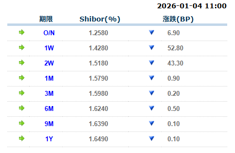 新华财经北京1月4日电 人民银行4日开展365亿元7天期逆回购操作;鉴于当日有2701亿元7天期和2000亿元14天期逆回购到期,公开市场实现净回 笼4336亿元。 上海银行间同业拆放利率(Shibor)7天、14天品种大幅回落超40BP。具体来看,隔夜Shibor下跌6.90BP,报1.2580%;7天Shibor下跌52.80BP,报 1.4280%;14天Shibor下跌43.30BP,报1.5180%。 | | | | 2026-01-04 11:00 | | --- | --- | --- | --- | | | 期限 | Shibor(%) | 涨跌(BP) | | 1 | O/N | 1.2580 | 6.90 | | 中 | 1W | 1.4280 | 52.80 | | 中 | 2W | 1.5180 | 43.30 | | や | 1M | 1.5790 | 0.90 | | ⇒ | 3M | 1.5980 | 0.20 | | 中 | 6M | 1.6240 | 0.50 | | 中 | 9M | 1.6390 | 0.10 | | 中 | 1Y | 1.6490 | 0.10 | 上海 ...
