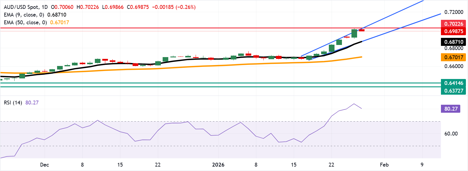 澳大利亚通胀数据与货币政策 - 澳大利亚12月CPI同比上升至3.6%,符合市场共识,此前修正值为3.5% [2] - 月度CPI环比上升1.0%,高于前值0%和市场预期的0.7% [2] - 整体通胀率仍高于澳大利亚储备银行2-3%的目标区间,强化了其收紧货币政策的可能性 [2] - 澳大利亚RBA修正后的均值通胀率同比上升3.3% [2] 澳大利亚经济指标表现 - 澳大利亚1月标准普尔全球制造业PMI为52.4,高于前值的51.6 [4] - 1月服务业PMI大幅上升至56.0,前值为51.1 [4] - 1月综合PMI为55.5,前值为51.0 [4] - 12月就业变化大幅反弹至65.2K,远超市场共识的30K及11月的28.7K [4] - 12月失业率降至4.1%,低于市场共识的4.4%及前值的4.3% [4] 澳元兑美元汇率走势 - 澳元兑美元在数据公布后小幅走低,交易于0.6990附近 [2][3] - 日线图显示该货币对处于上升通道内,但14天相对强弱指数为80.27,处于超买状态 [3] - 关键阻力位在0.7022附近,为2023年2月以来最高水平 [3] - 主要支撑位在9日指数移动平均线0.6871,若跌破通道可能下探50日EMA的0.6701 [3] 美元指数与市场情绪 - 美元指数在美联储决策前交易于96.10附近,此前下跌超过1% [4] - “卖出美国”的主题持续存在,推动DXY跌至2022年2月以来最低水平 [2][4] - 市场普遍预计美联储将维持利率在3.50%-3.75%不变 [4] - 美国ADP就业变化4周平均值报告为7.75K,略低于前值的8K [4] 国际政治与贸易动态 - 美国总统特朗普表示美元价值“很好”,其评论对美元施加了卖压 [4] - 特朗普警告若加拿大与中国达成贸易协议,将对加拿大商品征收100%的关税 [4] - 加拿大总理澄清该国没有计划与中国追求全面的自由贸易协议 [4]