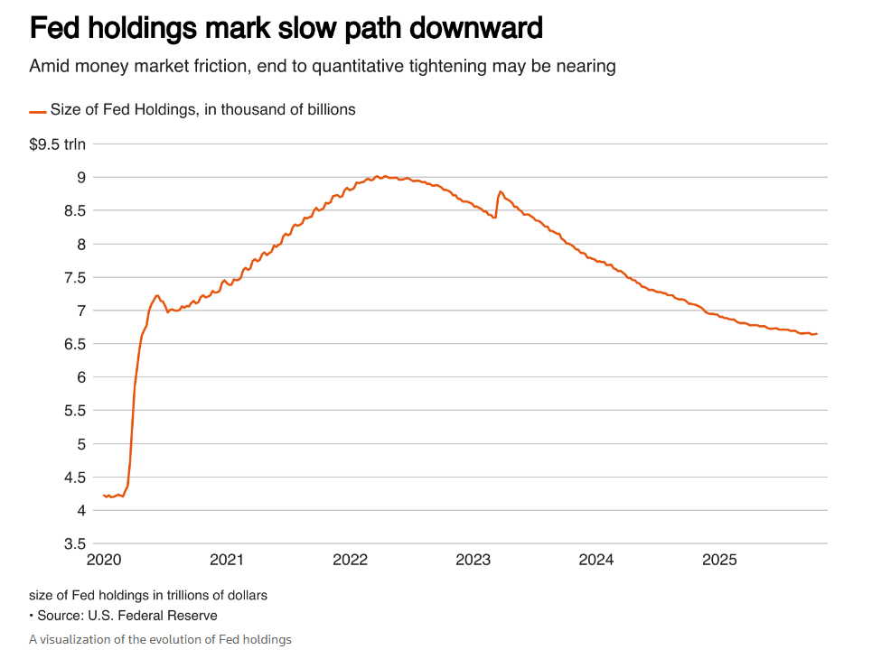 政策预期转变 - 多家华尔街分析机构预测美联储可能在本月底的会议上宣布终止资产负债表缩减计划(QT) [1] - 政策预期转变源于近期市场异动 包括金融机构意外动用美联储常备回购工具及关键短期拆借利率上涨 [2] - 美联储主席鲍威尔表示QT可能会在未来几个月内终止 [2] 政策调整原因 - 货币市场摩擦加剧可能影响通胀与就业双重目标的实现 构成政策转折的充分警示信号 [1] - 终止QT有助于确保货币政策技术层面的平稳运行 并应对年末可能来临的流动性压力 [1] - 美联储面临的挑战在于难以判断移除多少流动性会导致市场波动失控 [6] 量化紧缩进程回顾 - QT计划旨在收回2020年新冠疫情期间为刺激经济及稳定债券市场而注入的流动性 [3] - 美联储总资产规模在2022年夏季增至9万亿美元 较此前翻了一倍多 目前通过债券到期不续作已降至6.6万亿美元 [3] - QT至今主要消耗的是美联储逆回购工具中的过剩流动性 银行准备金规模一段时间以来维持在接近3万亿美元 [6] 机构观点与预测 - Wrightson ICAP预计FOMC将在本月会议上终止证券减持计划 [1] - Evercore ISI认为美联储或将在10月会议上释放结束QT的信号 但实际终止操作可能延迟一两个月执行 [1] - 杰富瑞预计美联储将在本月底的下次会议上完全终止QT 但抵押贷款支持证券的减持进程可能仍按当前缓慢节奏进行 [1] - 高盛预测团队预计FOMC将在明年1月会议上宣布缩表计划于2月终止 较原先的一季度末预期明显提前 [9]
