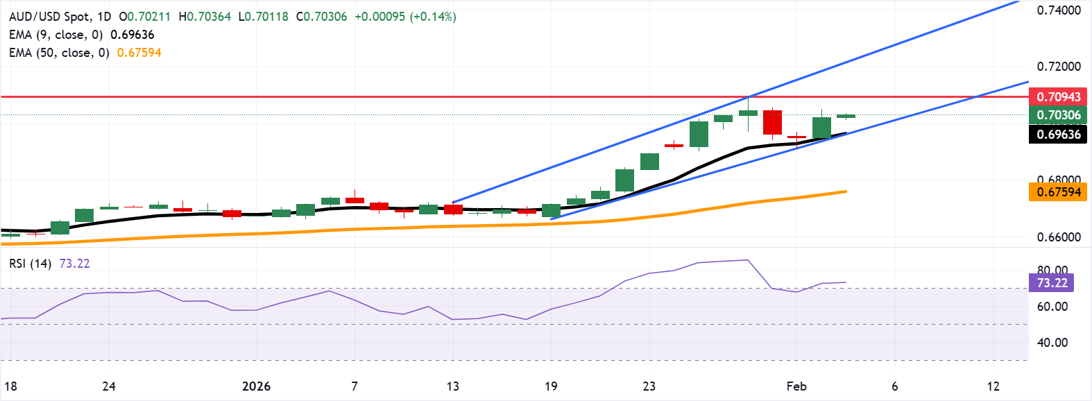 澳元兑美元汇率近期表现与驱动因素 - 澳元兑美元周三盘中触及0.7094,创2023年1月以来新高,逼近0.7100关口 [1] - 汇率延续前一交易日超1%的涨幅,此轮上涨由多重因素共同推动 [1] 中国经济数据对澳元的支撑 - 作为澳大利亚最大贸易伙伴,中国经济景气度直接影响澳元走势 [2] - 1月中国服务业PMI从52.0升至52.3,高于预期的51.8,制造业PMI从50.1微升至50.3,连续两个月处于荣枯线以上 [3] - 经济数据向好提振了澳大利亚大宗商品出口预期,2025年第四季度澳大利亚出口价格环比上涨3.2%,创年内最大涨幅,进口价格同步回升0.9% [3] 澳大利亚国内经济强劲表现 - 澳大利亚国内经济的强劲表现是澳元上涨核心动力 [3] - 1月标普全球综合PMI从51.0跃升至55.7,创45个月来最强扩张纪录 [3] - 1月服务业PMI从51.1攀升至56.3,达2022年2月以来最高水平,连续24个月保持在荣枯线上方 [3] - 就业市场同步回暖,12月ANZ招聘广告数量环比激增4.4%,创2022年2月以来最强单月增长 [3] 澳洲联储货币政策转向 - 经济超预期表现推动澳洲联储重启紧缩周期 [3] - 周二澳洲联储将官方现金利率上调25个基点至3.85%,为2023年11月以来首次加息 [4] - 澳大利亚12月CPI环比上涨1.0%,远超预期的0.7%,修正平均通胀率同比达3.3%,1月TD-MI通胀指标同比上涨3.6%,均高于2%-3%的通胀目标区间 [4] - 澳洲联储行长表示当前通胀压力过强,回归目标水平的时间将长于预期 [5] - 市场预计澳洲联储5月加息概率升至80%,年内或再加息约40个基点,利差优势吸引资金流入澳元资产 [6] 美元指数阶段性走弱 - 美元指数近期持续走弱,连续两个交易日低迷,当前交投于97.40附近 [6] - 美国政府停摆风波结束后,劳动力市场数据发布延迟,市场对美国经济判断缺乏关键数据支撑 [6] - 美联储官员表态趋于谨慎,认为当前利率接近中性,无需进一步降息 [6] - 美国12月PPI数据超预期走强,同比维持3.0%,核心PPI同比升至3.3%,但市场对美联储提前降息的预期未完全消退 [6] 技术面分析 - 澳元兑美元日线图处于上升通道内,多头趋势完整 [8] - 14日RSI指标升至73.30,看涨动能较强但已进入超买区间,短期或面临调整压力 [8] - 汇价关键阻力在0.7100关口,突破后将测试通道上轨0.7210 [8] - 下方支撑集中在9日EMA均线0.6964,与通道下轨重合,跌破后或下探50日EMA均线0.6759 [8]