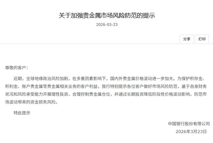 中国银行提示加强贵金属市场风险防范