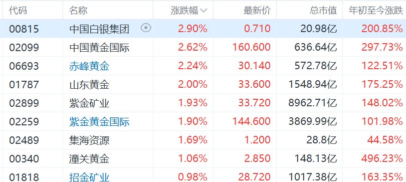 核心观点 - 美联储降息及购买国债计划刺激金银价格走强,进而推动港股黄金板块集体上涨 [1] 市场表现 - 12月12日,港股黄金股集体上涨,中国白银集团、中国黄金国际、赤峰黄金、山东黄金涨幅均超过2%,紫金矿业、紫金黄金国际涨幅接近2% [1] - 中国白银集团股价上涨2.90%,报0.710港元,总市值20.98亿港元,年初至今累计上涨200.85% [2] - 中国黄金国际股价上涨2.62%,报160.600港元,总市值636.64亿港元,年初至今累计上涨297.73% [2] - 赤峰黄金股价上涨2.24%,报30.140港元,总市值572.78亿港元,年初至今累计上涨122.51% [2] - 山东黄金股价上涨2.00%,报33.600港元,总市值1548.94亿港元,年初至今累计上涨175.25% [2] - 紫金黄金国际股价上涨1.90%,报144.600港元,总市值3869.99亿港元,年初至今累计上涨101.98% [2] 价格驱动因素 - 美联储宣布降息25个基点,并表示将在未来30天内购买400亿美元国库券 [1] - 美联储将于周五根据新计划购买82亿美元的国库券 [1] - 现货黄金价格涨至4285美元/盎司,现货白银价格突破64美元/盎司,续刷历史新高 [1]