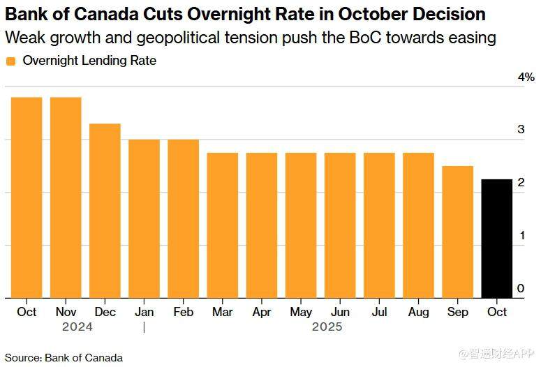 北京时间周三深夜,作为"全球央行十二时辰"的序章, 加拿大央行如期打出25个基点的降息。 同样如外界预料, 加央行也在政策决议中暗示现在 已经接近本轮降息周期的末尾 ——除非与美国的贸易冲突带来更严重的经济冲击。 在加央行之后,美联储将在周四凌晨发布利率决议,日本央行和欧洲央行分别将在周四中午和晚间披露货币政策。 政策决议宣布,因美国关税带来的冲击,调降政策利率25个基点至2.25%。 这是加央行连续第二次会议降息,该国的利率目前处于2022年 7月以来最低水平。 政策声明表示, 如果通胀和经济活动大体按十月预测演变,管理委员会认为目前的政策利率处于一个大致合适的水平,既能使通胀接近 2%,又能在这一结构性调整时期帮助经济。 马克莱姆在记者会上也表示,贸易战虽压制了需求,但也为许多企业增加了成本。央行预计这些力量会相互抵消。 (来源:加央行) 同时鉴于"美国贸易行动对经济增长和通胀的影响已有所明晰",10月的加拿大《货币政策报告》时隔9个月恢复公开经济预测。 与1月时的 预测相比, 加拿大央行将加拿大经济2025年增长预期下调至1.2%,并将2026年预期下调至1.1%,此前两年均预计为1.8%。 由于美国关 ...