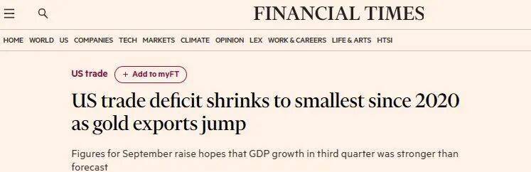 美国贸易逆差在9月收窄幅度超出预期,降至逾五年来最低水平,令市场对第三季度净出口为经济增长提 供提振的预期升温。 (截图来源:英国《金融时报》) 根据美国商务部周四(12月11日)公布的数据,商品出口与进口之间的差额较上月下降11%,至528亿美元。 这使逆差降至2020年6月以来最小,同时也低于路透调查经济学家此前预测的633亿美元。 出口较8月增长3%,至2893亿美元,主要由非货币性黄金推动。进口则上升0.6%。 美国经济分析局(BEA)将于12月23日公布第三季度GDP初值,届时会纳入上述贸易数据。 数据公布后,亚特兰大联储估计,截至9月30日的三个月里,美国实际GDP增速将达到3.6%,较其12月5日 的前次预测上调0.1个百分点。 英国路透社在贸易数据发布前调查的经济学家则预计,该期间经济增速为3%。 美国财政部长贝森特(Scott Bessent)对经济前景表示乐观。他周日对CBS表示:"尽管发生了'舒默导致的关 门',我们仍将以3%的实际GDP增速结束这一年。" 凯投宏观(Capital Economics)北美首席经济学家Paul Ashworth表示,9月出口增加87亿美元中,大部分来自 ...