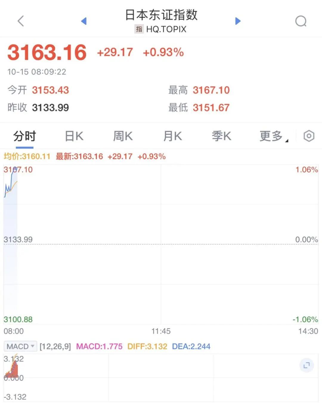 10月15日,日本股市高开高走,日本东证指数一度涨超1%。 | 名称 | 现价 | 涨跌幅÷ | 总市值 三 | | --- | --- | --- | --- | | MERCARI软件 | 2292.0 | 9.95% | 3773亿 | | 4385.T | | | | | 日本永旺 | 1971.0 | 4.92% | 54863亿 | | 8267.T | | | | | 札幌 | 7891.0 | 4.48% | 6218亿 | | 2501.T | | | | | 马自达汽车 | 1090.0 | 4.36% | 6887亿 | | 7261.T | | | | | 科乐美集团 | 22415.0 | 3.97% | 32166亿 | | 9766.T | | | | | 久保田 | 1973.5 | 3.87% | 22713亿 | | 6326.T | | | | | 瑞萨电子 | 1770.0 | 3.48% | 33110亿 | | 6723.T | | | | | 安川电机 | 4197.0 | 3.32% | 11193亿 | | 6506.T | | | | | 住友金属矿山 | ...
