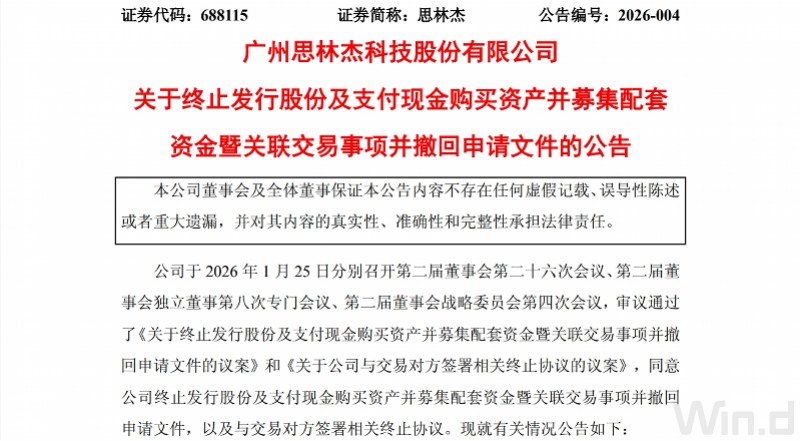 交易终止公告 - 思林杰于2026年1月末发布公告,经董事会审议决定终止重大资产重组 [1] - 公司原计划通过发行股份及支付现金的方式购买科凯电子的股权,并配套募集资金 [1] - 终止原因为交易规模较大、涉及相关方较多导致方案论证历时较长,且市场环境较交易筹划初期已发生一定变化 [1][5] 收购标的背景 - 科凯电子主营业务为高可靠微电路模块的研发、生产及销售,主要产品包括电机驱动器、光源驱动器、信号控制器等 [2] - 科凯电子曾于2023年6月递交招股书冲刺IPO,于2024年4月15日IPO撤单 [2] - 2025年3月,深交所罚单揭露科凯电子存在研发投入虚增、内控执行混乱、生产成本核算不规范等核心问题 [2] - 在IPO遇挫后,科凯电子转向并购,思林杰于2024年9月公告拟收购其71%股份 [2] 交易特征与市场关注 - 该交易具有“蛇吞象”特点,2024年思林杰归母净利润为0.15亿元,而同期科凯电子归母净利润为1.00亿元,盈利能力超思林杰6倍 [3] - 2023年科凯电子归母净利润曾达到1.67亿元 [3] - 两家公司估值存在倒挂情况 [3] - 两家公司主营业务及主要客户均不同,业务协同效应曾受质疑 [3] - 思林杰深耕消费电子检测设备,客户高度依赖苹果产业链 [3] - 科凯电子客户集中度极高,报告期内前五大客户收入占比均超过99%,其中对中国兵器工业集团下属单位的收入占比最高达73.40% [3] - 为回应质疑,思林杰曾描绘与科凯电子作为上下游企业生产无人机整机的蓝图 [3] 标的估值变化 - 2025年9月披露的加期评估报告显示,以2024年12月31日为基准,科凯电子股东全部权益价值为18.52亿元 [4] - 该估值较其此前申报IPO时的56.71亿元估值,直降38.19亿元 [4] 管理层说明 - 在2026年1月27日的投资者说明会上,公司董事长表示重组历时较长,其间市场环境等发生客观变化,导致交易方案推进的不确定性增加 [5] - 公司董秘进一步补充,基于审慎原则,经与交易各方协商后决定终止本次交易 [5]