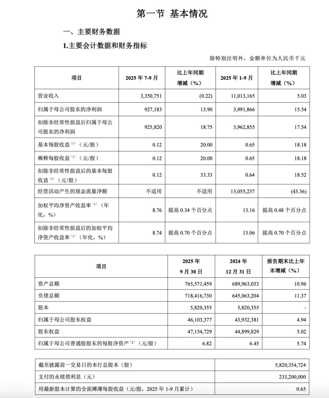 核心财务业绩 - 2025年前三季度营业收入6109.68亿元,同比增长1.98% [1] - 归属于母公司股东的净利润2699.08亿元,同比增长0.33% [1] - 基本每股收益0.73元 [1] - 非利息收入表现强劲,达1375.52亿元,增长12.40% [1] - 手续费及佣金净收入908.68亿元,增长0.60% [1] 盈利能力与效率 - 利息净收入4734.16亿元,下降0.70% [1] - 年化净利息收益率1.28%,下降15个基点 [1] - 营业费用(不含税金及附加)1622.38亿元,增长3.16% [1] - 成本收入比26.55% [1] 资产质量与风险抵补 - 计提各类资产减值损失1270.93亿元,下降1.69% [1] - 贷款减值损失1374.73亿元,增长12.00% [1] - 不良贷款余额4048.38亿元,比上年末增加253.80亿元 [3] - 不良贷款率1.33%,下降0.01个百分点 [3] - 拨备覆盖率217.21%,上升2.30个百分点 [3] 资产负债规模与结构 - 报告期末总资产528,134.21亿元,比上年末增加39,916.75亿元,增长8.18% [2] - 客户贷款及垫款总额304,519.29亿元,增加20,797.00亿元,增长7.33% [2] - 贷款结构:公司类贷款188,728.14亿元,个人贷款91,015.53亿元,票据贴现24,775.62亿元 [2] - 投资164,650.39亿元,增加23,114.63亿元,增长16.33% [2] - 总负债486,196.38亿元,比上年末增加37,851.58亿元,增长8.44% [2] - 客户存款373,078.24亿元,增加24,708.51亿元,增长7.09% [2] - 存款结构:定期存款225,031.49亿元,活期存款140,489.97亿元,其他存款2,586.69亿元,应计利息4,970.09亿元 [2] 资本充足水平 - 核心一级资本充足率13.57% [3] - 一级资本充足率14.80% [3] - 资本充足率18.85%,均满足监管要求 [3]