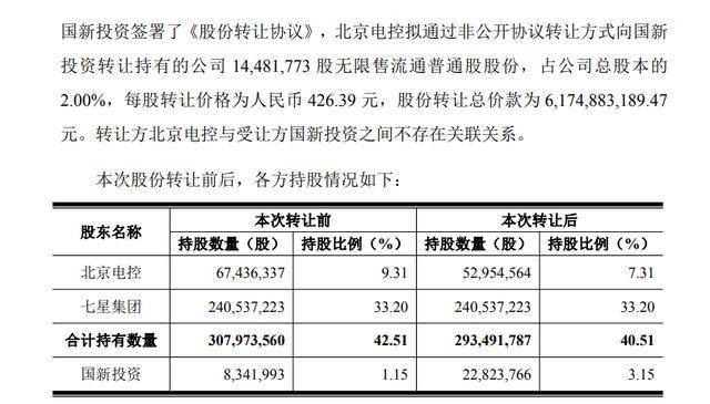 北方华创实控人北京电控拟转让2%股份给国新投资,交易总额61.75亿元