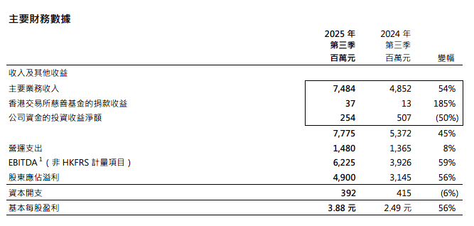 11月5日,港交所最新公布的财报显示,香港交易及结算所有限公司三季度净收入达到49亿港元(6.3亿 美元),较去年同期大幅增长56%。 财报还显示,三季度收入及其他收益为77.75亿港元,较2024年第三季上升45%,主要业务收入较2024 年第三季上升54%,源于现货市场成交量创新高,使交易及结算费增加。 | | 2025 年 | 2024 年 | | | --- | --- | --- | --- | | | 第三季 | 第三季 | | | | 百萬元 | 白龍元 | 雙幅 | | 收入及其他收益 | | | | | 主要業務收入 | 7.484 | 4,852 | 54% | | 香港交易所慈善基金的揭款收益 | 37 | 13 | 185% | | 公司資金的投資收益淨額 | 254 | 507 | (50%) | | | 7,775 | 5,372 | 45% | | 營運支出 | 1,480 | 1,365 | 8% | | EBITDA (非HKFRS 計量項目) | 6,225 | 3,926 | 59% | | 股東應佔溢利 | 4,900 | 3,145 | 56% | | 資本開支 | ...