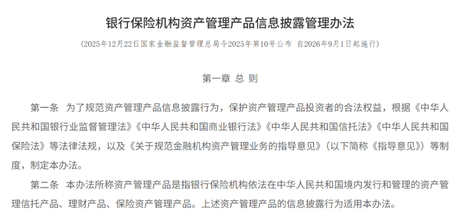 你是否会遇到这些问题,资管产品收益找不到,看不懂,收益显示高、但拿不到? 针对这些金融产品的信息披露问题,近日,金融监管总局发布《银行保险机构资产管理产品信息披露管理办法》(以下简称 《办法》),明确了信托产品、理财产品、保险资管产品的信息披露基本原则、责任义务、共性内容及内部管理要求。 实际上,早在今年5月,国家金融监督管理总局就发布过《办法》的征求意见稿,从实际落地情况来看,正式的《办法》相比征 求意见稿更加完善,同时补充了多个具体情况下的操作指引。《办法》也给予了资管机构8个月的过渡期,将于2026年9月1日开 始施行。 具体来看,有以下十大重点变动: 4、 修订:对于非现金管理类产品,应当披露本报告期期末的产品份额净值、份额累计净值和资产净值,本报告期收益表现情 况、收益分配情况;对于现金管理类产品,应当披露本报告期期末的资产净值,本报告期的产品年化收益率情况。 解读:新增现金管理类产品年化收益披露要求。记者查阅多分现金管理类产品的季度报告发现,目前对产品期末的资产净值均 有统一披露,但仅有部分报告披露产品收益情况,且标准不一,有近一个月、三个月、年初以来等,较少披露年化收益。 5、 修订:对于现金管 ...