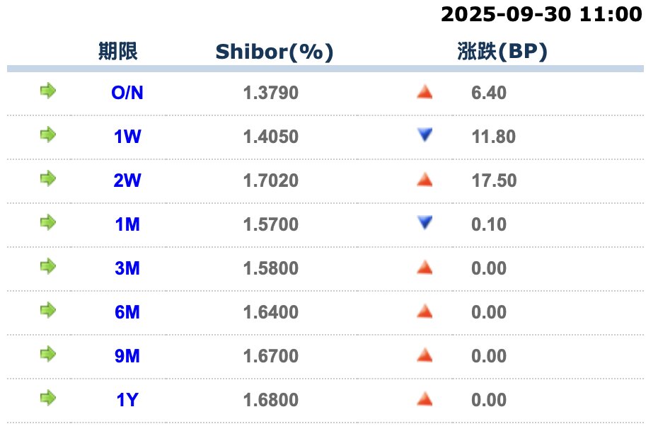 转自:新华财经 新华财经北京9月30日电(幸骊莎)人民银行30日开展2422亿元7天期逆回购操作,操作利率为1.40%,与此前持平;鉴于当日有2761亿元7天期逆回购到 期,公开市场实现净回笼339亿元。 上海银行间同业拆放利率(Shibor)7天品种回落,14天品种大幅回升。具体来看,隔夜Shibor上涨6.40BP,报1.3790%;7天Shibo下跌11.80BP,报 1.4050%;14天Shibor上涨17.50BP,报1.7020%。 上海银行间同业拆放利率(9月30日) | | | | 2025-09-20 TT:00 | | --- | --- | --- | --- | | | 期限 | Shibor(%) | 涨跌(BP) | | 0 | O/N | 1.3790 | 6.40 | | 1 | 1W | 1.4050 | 11.80 | | 中 | 2W | 1.7020 | 17.50 | | 0 | 1M | 1.5700 | 0.10 | | 中 | 3M | 1.5800 | 0.00 | | 中 | 6M | 1.6400 | 0.00 | | 1 | 9M | 1.6700 | ...