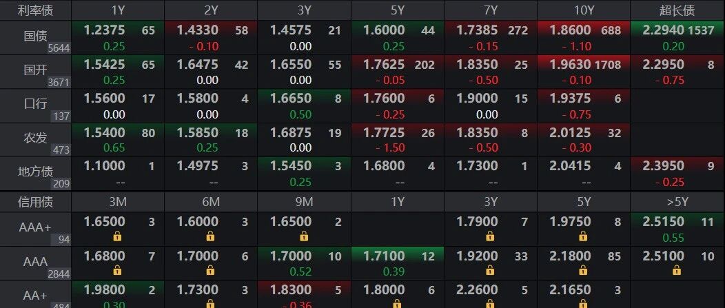 央行公开市场操作 - 央行开展2733亿元7天期逆回购操作,净投放1156亿元(377亿元逆回购及1200亿元国库现金定存到期)[2] - 大额净投放带动债市情绪修复,10Y国债利率最低下至1.8625%,但受股市微涨和资金面收敛影响,最终收于1.885% [4] 资金面与利率变动 - 税期资金面边际收敛,DR007上行至1.96%,资金价格偏贵 [2] - R001加权利率1.91%,成交量46855.43亿元(占比84.65%);R007加权利率1.98%,成交量7400.72亿元(占比13.37%)[3] - 10Y国债利率震荡区间1.8625%-1.8975%,收盘1.885%(下跌0.75BP)[7] 债市情绪与市场反应 - 债市对央行操作敏感,投资者担忧后续净回笼,情绪谨慎 [5] - 市场传闻“失忆底”“哭泣底”反映债市压力,10Y国债波动30BP引发热议 [5] - 各期限国债收益率多数下行,如2Y国债下跌4BP至1.53%,5Y国债下跌1BP至1.70% [8] 海外资产与跨市场影响 - 隔夜中资海外资产普涨,早盘债市情绪偏谨慎 [4] - 股市微涨对债市利率下行形成压制 [4]