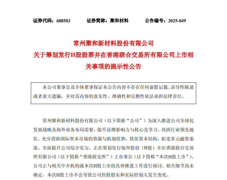 公司资本战略 - 公司计划发行H股以深化海外业务战略并强化品牌竞争力 [1] - 赴港上市旨在依托国际资本市场优化资本结构并拓展融资渠道 [3] - 公司资本战略正在从A股升级至A+H股模式 [4] H股发行进展 - 公司已启动与中介机构的细节磋商但具体发行方案尚未最终确定 [1] - 当前H股上市计划仍处于初步筹划阶段 [4] - 具体方案确定后尚需提交公司董事会和股东会审议并需获得中国证监会香港联交所和香港证监会的批准核准或备案 [4] 公司治理影响 - 本次H股上市不会导致公司控股股东和实际控制人发生变化 [4] - 控股股东和实际控制人不变有助于维持公司治理结构的稳定性 [4]