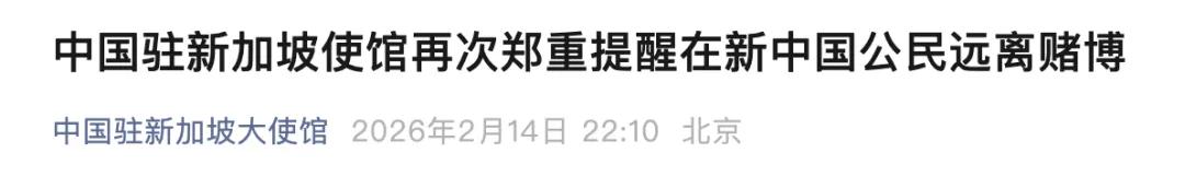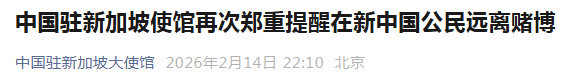 中国公民境外赌博相关法律风险与领事提醒 - 中国法律严禁赌博,刑法修正案已将跨境赌博正式入刑,中国公民跨境赌博涉嫌触犯中国法律,参与组织赌博等行为将被依法追究,使领馆无法对违法行为提供领事保护 [1] - 中国驻新加坡大使馆处理了数起因赌博导致的死亡案件,并再次郑重提醒来新中国游客及在新中国公民切实增强法律意识,远离赌博 [1] 赌博活动带来的个人与社会危害 - 参与赌博面临财散、家破、人亡的不归之路 [1] - 跨境赌博还可能带来诈骗、洗钱、绑架、拘禁、拐卖、偷渡等衍生风险 [1] 中国打击跨境赌博的举报渠道 - 中国公安部已开通打击治理跨境赌博综合举报平台,接受关于中国公民在境外开设或经营赌场、组织招揽中国公民赴境外赌博或参与跨境网络赌博相关线索的举报 [1] - 举报渠道包括举报邮箱(110@interpol.gov.cn)、传真(0086-10-66261404)以及“拒绝跨境赌博”微信公众号 [2]
