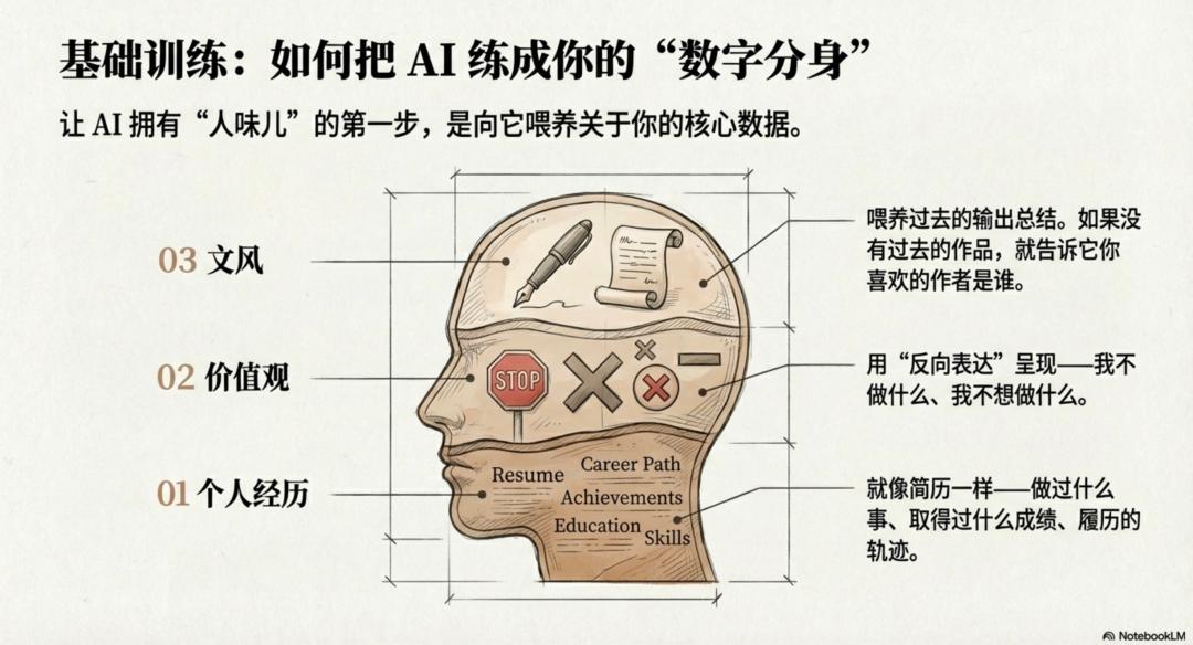 行业核心观点 - AI工具显著提升了内容创作的效率与产出样式,使得小团队甚至个人能够完成以往需要更多资源的工作,降低了成本并加快了速度 [66] - 在AI辅助内容生产成为常态的背景下,具备“人味”的内容将成为最稀缺、最具差异化价值且最能建立信任的关键竞争要素 [1][67] - 对于缺乏大量粉丝或显赫背景的个体创作者而言,AI工具的出现降低了竞争门槛,将挑战转化为机遇 [1] 内容创作方法论 - **身份认同**:创作者的社会阶层、身份背景与个人经历构成了最本质的差异化,决定了其受众与目标客户,应将这些原生信息详细提供给AI以刻画独特风格 [9][10] - **细节体感**:真实、具体、充满感官细节的故事碎片(如动作、体感、环境)比AI的概括性语言更能打动读者,是建立情感连接的关键钩子 [17][20][22] - **保持偏见**:敢于表达与主流观点相左的“偏见”能形成强烈的辨识度,这实际上是一种价值观的筛选,有助于吸引同频受众 [27] - **价值观定义**:通过明确“拒绝”做什么(如拒绝贩卖焦虑、拒绝空洞理论)来反向定义清晰的价值观红线,能强化内容调性与受众认知 [28][30] - **粗糙感**:刻意保持内容中不完美、口语化、生活化的“粗糙感”,比AI默认的完美输出更具真实感和亲和力,能降低受众戒备 [34][35][37] - **深夜书房**:通过AI辅助进行适度的自我暴露,坦诚展现决策中的纠结、不确定性与遗憾,是建立深度信任的有效途径 [44][45][47] - **语言风格**:每个人独特的文字指纹(如句式长短、比喻偏好、逻辑与故事切换方式)是内容“口感”的核心,需通过训练让AI模仿以保持个人味道 [53][54][58] - **视觉特征**:独特的外貌、标志性场景或代表色等视觉元素构成“视觉锤”,能强化个人品牌在用户心中的识别度与记忆点 [61][62] 人机协作流程 - 创作者应主导最终的内容定稿环节,确保每个细节都符合个人风格,即“人不写初稿,AI不写终稿” [55][56] - AI在流程中主要起到加速和提效的作用,例如将原本需要4小时的写作过程缩短至1小时 [57] - 可通过向AI提供个人过往文章片段,并指令其分析总结写作风格后进行模仿,来批量生产符合个人调性的内容 [59][60]