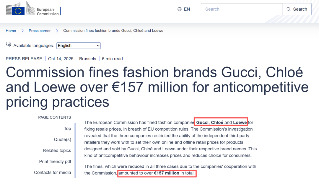 三家知名奢侈品公司,集体被罚! 10月14日,欧盟委员会官网显示,欧盟委员会因古驰(Gucci)、蔻依(Chloé)和罗意威(Loewe)存在反竞争定价行为,对三家公司处以合计超1.57亿 欧元罚款。 古驰、蔻依和罗意威总部分别位于意大利、法国和西班牙,三家公司均活跃于高端时尚产品的设计、生产和分销领域,包括服装、皮具和各种配饰。 调查显示,这三家时尚公司从事了一种称为"转售价格维持(RPM)"的做法,限制了其线上和实体零售商(均为独立转售商)设定其自身零售价格的能 力。侵权行为覆盖了整个欧洲经济区(EEA)领土。 具体而言,这三家时尚公司通过对其零售商施加限制来干预其商业策略,力求让零售商采用与其自身直销渠道相同的价格和销售条件。例如,要求零售商 不得偏离建议零售价格、最高折扣率以及特定销售时段;在某些情况下,禁止零售商提供任何折扣。 这三家时尚公司的侵权行为均于2023年4月结束,当时欧盟委员会对其经营场所进行了突击检查。欧盟委员会于2024年7月启动了正式程序。三家公司均明 确承认事实及其对欧盟反垄断规则的违反,这使得委员会能够根据反垄断合作程序结案。 罚款金额方面,古驰被处罚1.197亿欧元,蔻依被处 ...