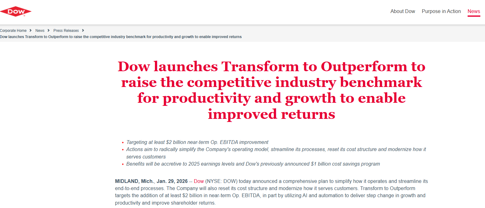 【DT新材料】 获悉,1月29日, 陶氏化学 宣布了一项全面计划" Transform to Outperform "(转型 增效 )全面重组计划,旨在简化其运营方式并优化其端到端流 程,并重新调整成本结构并改进为客户提供服务的方式。 "转型增效"计划 的目标是在短期内增加至少20亿美元( 约合人民币140亿元 )的运营息税折旧摊销前利润, 约三分之二的收益将来自生产效率的提升,三分之一 将来自业务增长。 公司预计与"转型以超越"计划相关的一次性成本约为11亿至15亿美元, 并引入人工智能与自动化技术, 其中包括为 约4500名员工提供的约6亿至8亿美元的遣散费 (约占公司13%) ,以及约5亿至7亿美元的其他一次性费用。据悉,陶氏在29个国家设有制造工厂,员工约34600人,此次裁员约占13%。 此次行动目标旨在实现显著的增长和生产力提升,从而提升道公司的竞争地位,将陶氏公司转变为一个更具韧性、持续实现增长、助力客户成功,并在整个周期中 为股东创造更大价值的公司,确保陶氏公司持续保持全球领先地位 。(更简单、更高效) | Year | Target Op. EBITDA ($MM) | Est. Cash ...