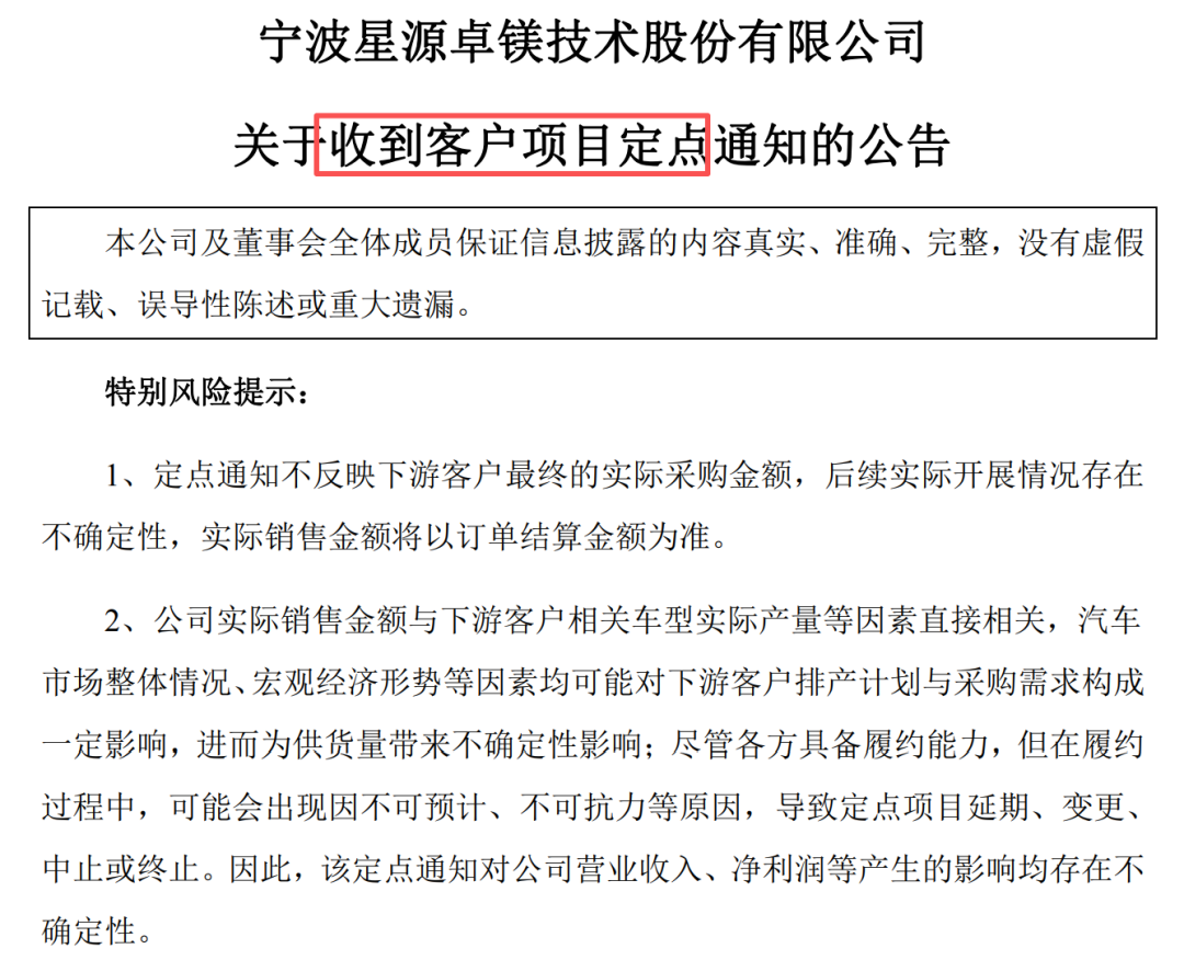 【导读】星源卓镁(301398)收到客户定点通知,预计四年销售金额20亿元,正发行可转债 但星源卓镁也在公告中表示,公司实际销售金额与下游客户相关车型实际产量等因素直接相关,汽车市场整体情况、宏观经济形势等因素均可能对下游客 户排产计划与采购需求构成一定影响,进而给公司的供货量带来不确定性。因此,该定点通知对公司营业收入、净利润等产生的影响均存在不确定性。 11月4日晚,星源卓镁公告,于近日收到国内某新能源汽车整车制造厂商(公司称限于保密要求,无法披露其名称)出具的供应商定点通知邮件,公司将 为该客户开发并供应新能源汽车镁合金动力总成壳体零部件。 记者注意到,这并不是星源卓美首次发布类似公告,但之前的金额均没有这一次的大。 2024年2月、5月、9月、10月和11月星源卓美均公告收到项目定点通知,项目生命周期金额分别为7年2.5亿元、 8年2.38亿元、3年1.7亿元、5年2.05亿元和 7年7.1亿元。2025年4月、8月,公司又公告收到定点通知,项目生命周期金额分别为4年6.5亿元、6年7.13亿元。这样,加上此次的20.21亿元,公司近两年 公告称,公司专注于轻量化材料在汽车零部件行业的创新设计及替代应 ...