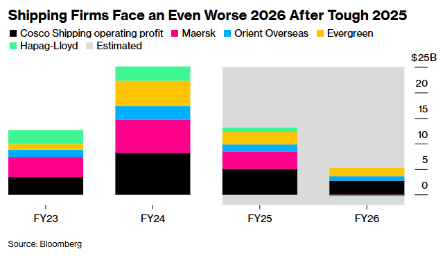 文章核心观点 - 全球集装箱航运业正为2026年盈利下滑做准备 红海航线潜在重启将加剧运力过剩并压低运价 主要航运公司面临业绩疲软甚至亏损的压力 [1][4][8] 行业供需与运价分析 - 行业面临结构性运力过剩 预计从2023年到2027年新船运力将激增36% [4] - 若集装箱航运公司全面重返红海航线 2026年集装箱航运需求预计将萎缩1.1% [4] - 截至1月29日当周 Drewry世界集装箱指数显示每个40英尺集装箱运价下降4.7%至2,107美元 [4] - 汇丰银行分析师此前预计若红海中断持续至2026年中 今年运价将下跌9%至16% 但若航运秩序恢复快于预期 运价可能进一步下跌10% [8] - 红海航运若快速恢复 初期可能因欧洲港口拥堵对运价形成支撑 若西方经济体在2026年上半年补库存也可能提供支撑 但随后运价将稳定在更低水平 [8] 主要航运公司表现与预期 - 马士基 赫伯罗特 日本邮船等在经历艰难的2025年后 预计2026年业绩将更为疲弱 [1] - 美国银行预计马士基将发布偏软的2026年利润指引 并将股票回购规模削减50% 市场一致预期马士基今年将取得自2017年以来的首次年度亏损 [8] - 汇丰银行指出 运价进一步下跌可能令马士基和赫伯罗特陷入亏损 [8] - 日本邮船等日本航运公司面临的盈利压力主要来自运力过剩和关税不确定性 [9] - 由日本邮船 商船三井和川崎汽船共同持有的Ocean Network Express第三财季净亏损8,800万美元 原因是新船数量增加及亚欧 亚美航线货流缓慢 [10] 红海局势与航线策略 - 红海航运通道潜在重启可能性上升 马士基自2023年也门胡塞武装开始袭击船只以来首次成功完成两次红海航行 [8] - 主要航运公司对大幅调整航线网络保持谨慎 因胡塞武装活动可能突然变化并迫使策略逆转 [9] - 法国达飞海运集团在让三条航线重返红海水道后又撤回了使用红海航线的决定 凸显该地区局势的高度波动性和不可预测性 [9] - 对于亚洲航运市场 今年最大的变数是红海航线是否全面重开 其重要性甚至超过关税因素 [9] - Ocean Network Express预计船舶仍将继续绕行好望角 第四季度运价将出现温和回升 [10] 区域市场差异 - 亚洲航运公司在利润率方面或许比欧洲同行更具优势 受益于更强劲的区域内需求及更具韧性的即期运价 [10] - 亚洲区域内贸易受益于更高的运营稳定性 因其较少暴露于关税以及红海安全风险等地缘政治扰动 [10]