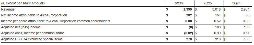 核心财务表现 - 第三季度营收达29.95亿美元,高于上年同期的29.04亿美元 [1] - 归属于公司的净利润为2.32亿美元,上年同期为9000万美元,同比增长近158% [1] - 调整后净亏损600万美元,上年同期为净利润1.35亿美元 [1] - 调整后EBITDA为2.70亿美元,低于上年同期的4.55亿美元 [1][2] - 经营活动产生现金8500万美元,期末现金余额15亿美元 [3]   运营与生产数据 - 第三季度氧化铝产量环比增长4%至250万吨,主因澳大利亚炼油厂维护减少及产量提升 [2] - 铝业务板块产量环比增长1%至57.9万吨,得益于西班牙圣西普里安冶炼厂重启顺利推进 [2] - 氧化铝业务第三方出货量环比持平于220万吨 [2] - 铝业务总出货量环比下降3%,系贸易量及出货时间调整所致 [2]   关键影响因素 - 美国对加拿大铝征收的关税导致本季度损失较上一季度增加6900万美元 [1] - 国内铝价上涨有效抵消了关税影响,中西部地区溢价涨幅已足以弥补净不利影响 [1] - 净利润包含出售Ma'aden合资企业权益收益及Ma'aden股票市价有利变动,但部分被重组费用抵消 [3] - 季度环比变化反映进口关税成本上升、巴西资产退役义务费用增加、汇率不利影响及氧化铝价格下跌 [3]   行业与市场动态 - 受特朗普贸易措施影响,2025年美国铝价涨幅持续领先国际市场 [3] - 中西部地区溢价自6月初已飙升113% [3] - 美国铝价上涨反映了库存下降及铝进口量减少 [4] - 特朗普今年3月对铝进口征收25%关税,6月翻倍至50% [4]   公司战略与展望 - 公司预计第四季度关税成本将再增5000万美元 [3] - 2025年氧化铝总产量预计维持950万-970万吨,出货量1310万-1330万吨 [4] - 2025年铝产量预计230万-250万吨,出货量250万-260万吨,与此前预测一致 [4] - 公司与纽约电力局签订长期能源合同,并对马塞纳冶炼厂阳极焙烧炉投资约6000万美元 [3] - 公司获得美澳政府支持,推进澳大利亚Wagerup炼油厂镓工厂共建项目 [3]