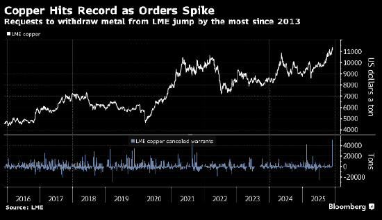 铜价表现 - 伦敦金属交易所铜价创下纪录新高,突破每吨11400美元,日内上涨2.4% [1] - 铜价今年累计涨幅已达约30% [3] - 铝价上涨0.9%,锌价上涨0.8% [3] 价格驱动因素 - 伦敦金属交易所仓库的铜提货请求创下2013年以来最大增幅,主要由亚洲的申请推动 [1] - 中国台湾和韩国的铜订单激增 [1] - 市场对供应短缺的预期是近期涨势主因,交易商为规避潜在进口关税正将大量铜金属转移至美国 [1] - 今年以来,从印尼到智利的矿山接连遭遇意外停产,供应问题主导市场走势 [1] 市场背景 - 投资者等待本周将公布的一系列美国数据,包括私营部门就业、进口价格和工业产出报告 [3]