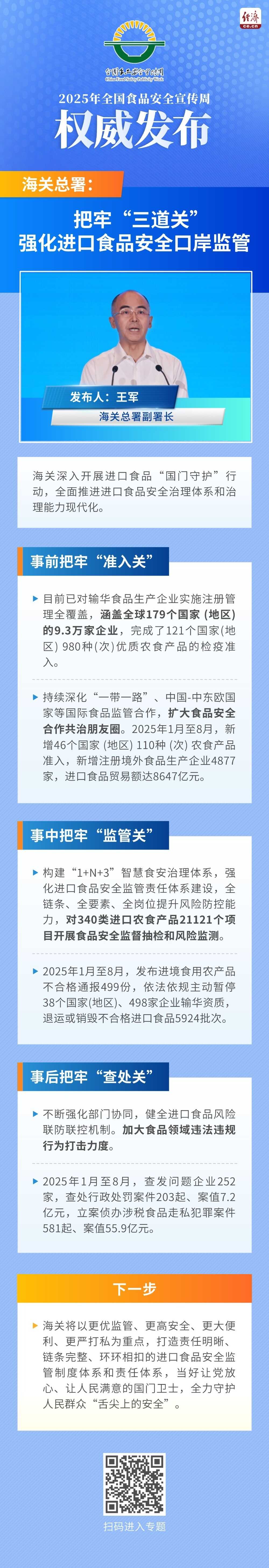 在事前把牢"准入关"方面,通过对进口食品境外生产企业100%注册、高风险进口食品100%官方推荐注 册,不断压实境外官方监管责任、企业主体责任,目前已对输华食品生产企业实施注册管理全覆盖,涵 盖全球179个国家(地区)的9.3万家企业,完成了121个国家(地区)980种(次)优质农食产品的检疫 准入。持续深化"一带一路"、中国-中东欧国家等国际食品监管合作,扩大食品安全合作共治朋友圈。 2025年1月至8月,新增46个国家(地区)110种(次)农食产品准入,新增注册境外食品生产企业4877 家,进口食品贸易额达8647亿元。 在事中把牢"监管关"方面,统筹推进智慧海关建设、"智关强国"行动,构建"1+N+3"智慧食安治理体 系,强化进口食品安全监管责任体系建设,全链条、全要素、全岗位提升风险防控能力,对340类进口 农食产品21121个项目开展食品安全监督抽检和风险监测,推动智慧监管更高效、风险监测更聚焦、监 督抽检更科学、监管体系更完备。2025年1月至8月,发布进境食用农产品不合格通报499份,依法依规 主动暂停38个国家(地区)、498家企业输华资质,退运或销毁不合格进口食品5924批次。 在事后把牢" ...