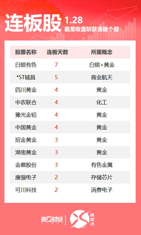 市场涨停概况 - 1月28日A股市场共计85只个股涨停 [1] - 黄金板块多股出现连续涨停行情 [1] 黄金与白银板块表现 - 白银有色因涉及白银与黄金概念收获7连板 [1] - 四川黄金、豫米金铝、中国黄金均收获4连板 [1] - 招金黄金与湖南黄金均收获3连板 [1] - 美徽股份因属于有色金属概念收获3连板 [1] 其他板块连板个股 - *ST铖昌因商业航天概念收获5连板 [1] - 中农联合因化工概念收获4连板 [1] - 康强电子因存储芯片概念收获2连板 [1] - 可川科技因消费电子概念收获2连板 [1]