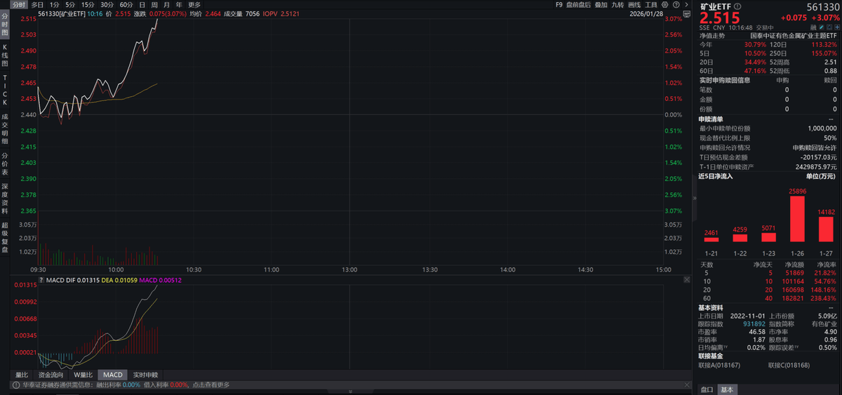 国际金价突破5200美元/盎司大关,有色金属牛市持续,矿业ETF(561330)大涨超3%