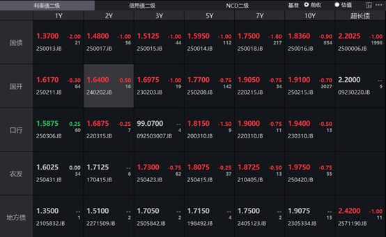 | | NCD三级 都准 ◎ 前收 ● 结值 利率债二级 信用债二级 | | | | | | | | | | --- | --- | --- | --- | --- | --- | --- | --- | --- | --- | | | 1Y 3Y 7Y 7 1 10Y 10Y 10 | | 2Y 200 - 11 - | | 5Y 5 | | | 超长债 | | | 国债 | 1.3700 -2.00 1.4800 -1.00 1.5125 -1.00 1.5950 -1.00 1.7500 -1.60 1.8360 -0.90 2.2025 -1.00 | 21 | 56 | 44 | 112 | 217 | 854 | | 1998 | | | 250013.18 250017.JB 250015.IB 250015.IB 250014.IB 250018.IB 250016.IB 2500006.IB | | | | | | | | | | | 1.6170 -0.30 1.6400 -0.50 1.6975 -1.00 1.7700 -0.75 1.9050 -0.75 1.9100 -0.70 2 ...