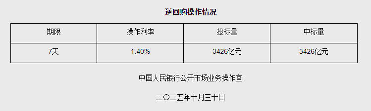 中新网10月30日电据央行网站消息,2025年10月30日中国人民银行以固定利率、数量招标方式开展了3426 亿元7天期逆回购操作。具体情况如下: | 逆回购操作情况 | | | | | --- | --- | --- | --- | | 期限 | 操作利率 | 投标量 | 中标量 | | 7天 | 1.40% | 3426亿元 | 3426亿元 | | 中国人民银行公开市场业务操作室 | | | | | 二〇二五年十月三十日 | | | | 图源:央行网站截图 (文章来源:中国新闻网) ...