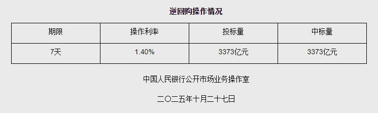 中新网10月27日电据央行网站消息,2025年10月27日中国人民银行以固定利率、数量招标方式开展了3373 亿元7天期逆回购操作。具体情况如下: (文章来源:中国新闻网) | | 逆回购操作情况 | | | --- | --- | --- | | 期限 操作利率 | 投标量 | 中标量 | | 1.40% 7 天 | 3373亿元 | 3373亿元 | | | 中国人民银行公开市场业务操作室 | | | | 二〇二五年十月二十七日 | | 图源:央行网站截图 ...
