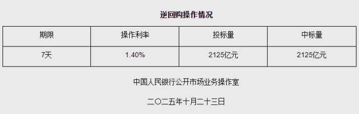 央行公开市场操作 - 中国人民银行于2025年10月23日进行了公开市场逆回购操作 [1] - 操作规模为2125亿元人民币 [1] - 操作期限为7天期 [1] 操作方式 - 操作采用固定利率和数量招标方式 [1]