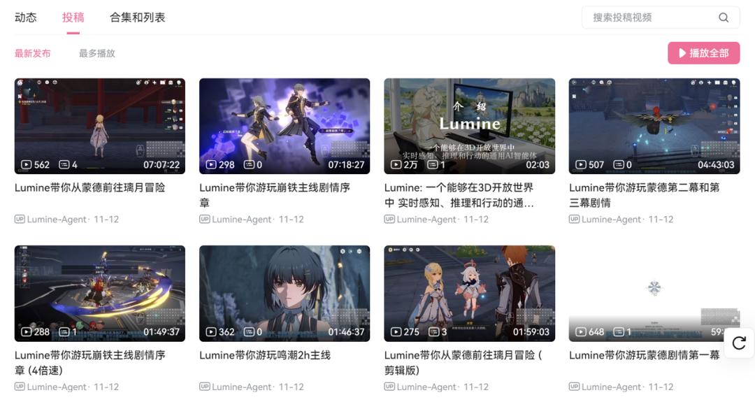 AI模型Lumine-Agent的技术能力 - 能够游玩《原神》《崩坏:星穹铁道》和《鸣潮》等3D开放世界游戏,并公开了总长超过25小时的8段实录视频[1] - 在《原神》中可完成基础交互(战斗后开宝箱、通关秘境、完成日常委托)、应对BOSS机制(理解无相之雷、风魔龙等BOSS玩法)、精密操作(飞行搜集、瞄准射击、解谜)以及界面适应(3D探索与2D界面切换)等复合操作[10][13][15][18] - 通过目标拆解可执行收集风神瞳、冻结水面取物、利用风场开箱等更复杂任务[19][20] - 在《鸣潮》中仅凭推理能力即以接近新手水平完成前两个剧情(约107分钟),在《崩坏:星穹铁道》中通关“黑塔”空间站主线耗时约7小时,比人类玩家平均速度(4.7小时)慢2.3小时[25][26][28] - 是目前唯一能在3D开放世界中完成数小时任务的AI智能体,其“Lumine-Instruct-NonHis”版本在四项关键测试中成功率均超过80%,性能显著优于GPT-5、Gemini 2.5 Pro等主流大模型[24] 技术实现与资源投入 - 采用视觉推理模式:由一台主机每200毫秒截一张图并提交推理请求,另一台主机负责推理并转化为鼠标键盘指令[33] - 使用总计约4500小时的《原神》视频数据进行训练,包括1731小时人类游戏数据用于预训练、200小时指令数据用于语言基础训练、15小时推理数据用于实现混合式思维[35] - 推理主机搭载4块H20显卡(价格超过30万人民币),训练整个Agent模型需要64块H100显卡,成本至少1500万元,项目总成本达数千万[35][37] - 团队来自字节跳动种子计划(ByteDance Seed),负责公司AI能力研究,技术已落地于飞书、火山引擎、豆包等应用[37][39] 行业应用潜力与竞争优势 - 相比游戏厂商自研AI(如《王者荣耀》“绝悟”测试架构动用60万个CPU核心和1064张显卡、成本数亿元;《逆水寒》手游每年投入约3000万元训练智能NPC),Lumine展现出训练成本较低的优势[49][57] - 具备通用性优势:仅依靠公开游戏资料和视觉推理模拟真实玩家操作,无需游戏内部数据,低训练门槛、高拟真度、隐私性好[53] - 潜在应用场景包括自动化游戏测试(可24小时不间断工作,模拟真实玩家复杂操作以高效发现BUG)以及反推游戏设计(AI自主生成地图、关卡等)[58][59] - 某深圳射击游戏厂商CEO透露,每年为游戏配备AI队友需向专业公司支付数千万元费用,证明该市场需求旺盛且盈利空间大[50]