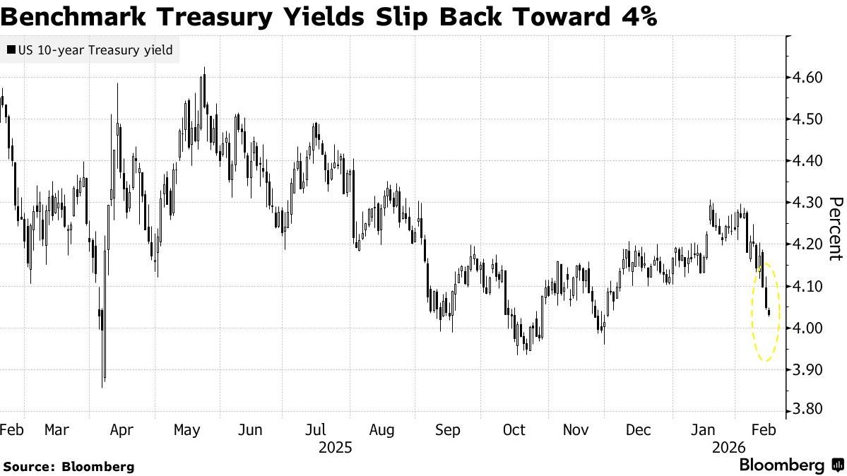 市场表现与价格动态 - 美国国债延续涨势,基准10年期国债收益率下滑2个基点至4.03% [1] - 两年期国债收益率在亚洲清淡交易中向2022年以来最低水平逼近 [1] - 该地区债券普遍上涨,澳大利亚和新西兰国债收益率亦小幅下滑 [3] - 日本国债收益率大幅下挫,美国股指期货回落 [3] 核心驱动因素 - 市场预期通胀放缓将促使美联储今年至少降息两次,推动美国国债上周强势收市 [1] - 上周美国CPI数据偏弱,以及股市中持续的量化基金系统性去杠杆,正在推动债券买盘 [3] 关键技术位与市场观点 - 从技术面看,美国10年期国债收益率4%水平正成为成败关键位,若该水平被跌破,预计收益率将大幅下挫 [3] 市场关注点与未来事件 - 交易员正密切关注美国就业市场更多数据以及美联储1月会议纪要,以期获得有关利率调整潜在时机的新线索 [3] - 5年期国债拍卖需求显现企稳迹象 [3]