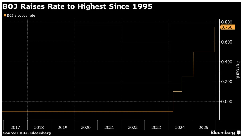 智通财经获悉,日本央行如市场所预期的那样宣布加息,一举将基准利率上调至30年来最高水平,并表 示如果条件允许,未来还会进一步加息。这一最新动态表明日本央行日益确信能够实现其十多年来一直 追求的长期稳定通胀与薪资稳定增速目标,日本央行将借贷成本提升至1995年以来最高,以及货币政策 声明透露出加息路径未完结,令金融市场押注日本央行将以每半年一次的步伐进行加息,直至达到 1.5%附近。 根据日本央行周五的声明,日本央行行长植田和男领导的日本央行货币政策委员会以一致决定(9:0全票 通过)将利率上调25个基点至0.75%,与华尔街经济学家们普遍预期完全一致。日本央行表示,其经济展 望得以实现的可能性正在显著上升。 值得注意的是,日本央行在最新发布的货币政策声明中明确表示加息周期将持续,称如果其经济展望持 续得以实现,该央行打算继续提高借贷成本。日本央行还表示,潜在通胀正在继续以温和态势良性上 升。 来自标普全球市场情报的首席经济学家Harumi Taguchi表示:"我认为这次加息早就应该进行了。从声明 来看,日本央行的立场依然不变,即如果经济和物价状况按预期发展,将继续加息。这意味着未来很可 能将进一步加息。" ...