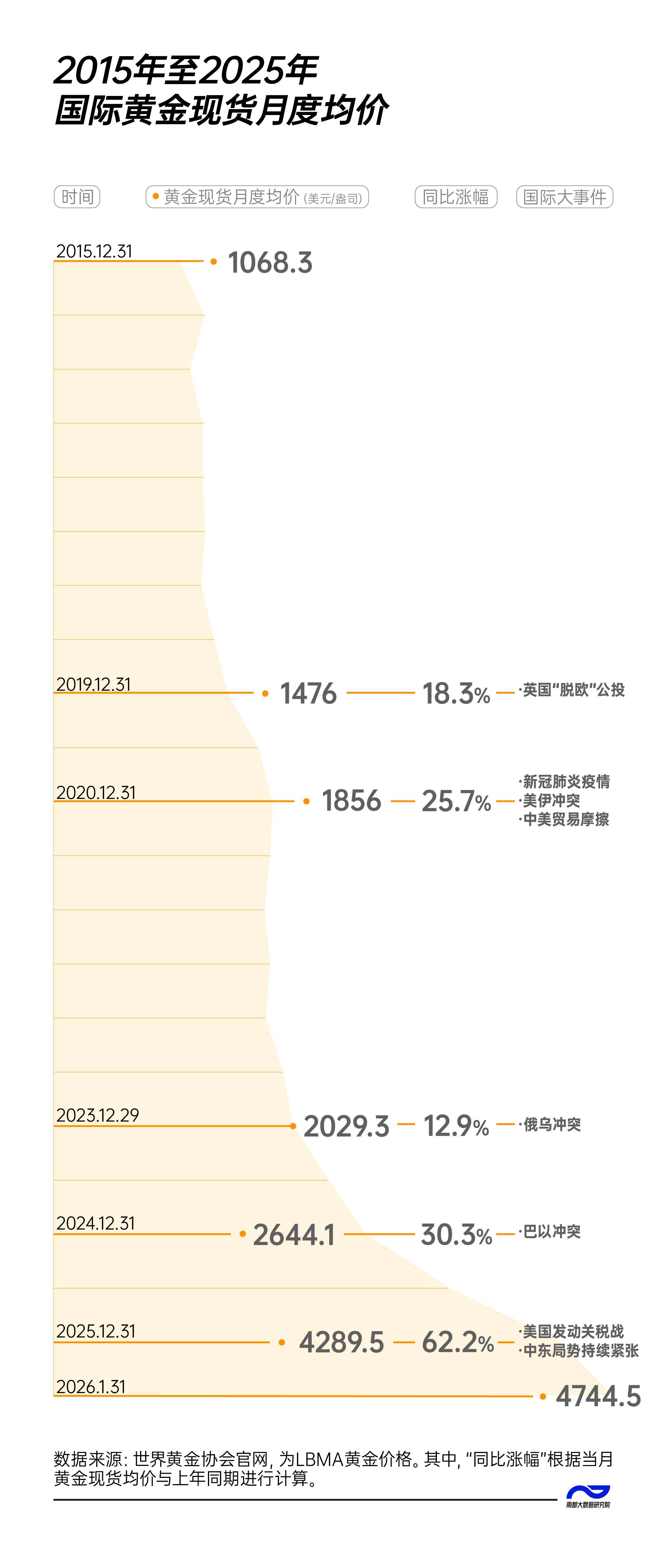 国际金价走势与驱动因素 - 2025年底国际市场黄金期货和现货价格均创历史新高 全年累计涨幅超过70% [1] - 金价上涨呈现“多重逻辑共振”特征 包括长期上涨趋势、地缘避险、通胀对冲及“去美元化”影响 [1] 地缘政治与避险需求 - 地缘政治乱局是金价上涨的最大推手 具体事件包括美国对委内瑞拉的行动、俄乌冲突僵局、中东局势不稳及欧洲问题 [2] - 美国战略调整带来的不可预期性增强了黄金的避险工具属性 [2] 国际货币体系与央行行为 - 国际货币体系正从单极向多元储备体系加速重构 [2] - 全球央行特别是新兴市场国家央行增持黄金以实现储备多元化 央行购金潮是“去美元化”的最直观体现 [2] 美元信用与资产属性 - 投资者对美元的购买力和保值性产生担忧 美国联邦政府债务规模突破38万亿美元侵蚀了美元信用 [2] - 美元“安全神话”破灭 黄金作为“非主权资产”的“终极避风港”价值重新凸显 [2]
