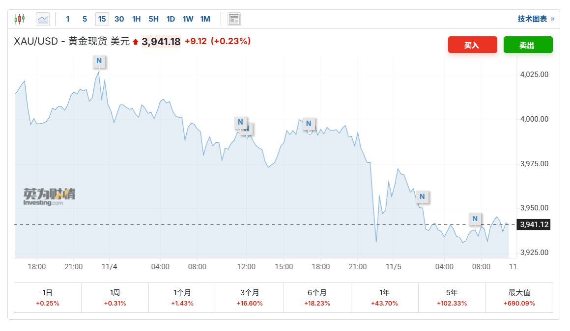 本周早些时候,三位美联储官员在权衡通胀与劳动力市场疲软的双重风险时,并未表示支持在12月进一步降息。本周投资者将有更多机会了解美联储官员的 立场,圣路易斯联储主席穆萨莱姆与克利夫兰联储主席哈马克等官员均计划发表讲话。 他补充称,尽管如此,今年推动金价上涨的因素大多仍未改变。在盘整阶段结束后,官方部门持续增持以及私人投资者的强劲需求,有望推动金价再度回 升。 截至发稿,现货黄金价格上涨0.23%,报每盎司3941.18美元。美元指数在收于5月中旬以来最高水平后,目前保持稳定。白银价格持平,钯金与铂金价格则 出现下跌。 黄金在经历一周多以来最大单日跌幅后出现反弹,因金融市场普遍的避险情绪提振了对避险资产的需求。 周三,现货黄金价格回升至每盎司3950美元附近。此前一个交易日,受美元指数连续第五日上涨影响,现货黄金价格一度下跌近2%。由于对估值高企的担 忧持续,全球股市在经历近一个月最严重下跌后周三延续跌势,多数大宗商品也同步走低。 今年以来,黄金价格累计涨幅仍保持在50%左右,上月曾触及历史高点后部分回落。此轮回调——出现在多个迹象显示金价涨势过猛之后——伴随着黄金 ETF资金的流出。交易员正在评估此轮下跌是否已 ...