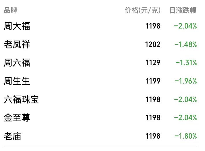 北京时间31日,现货黄金上涨后一度下破4000美元/盎司。 而国内部分品牌金饰克价重回1200元。31日,周生生金饰克价为1203元,较前一日上涨28元/克;老凤祥为1200元,单日上涨17元;老庙黄金为1192元/ 克,单日上涨20元/克。 | 周生生 | PROMESSA | MINTYGREEN | . N . March 1999 . 2 11-75 PM . 5 25 ( 1 ) 1 ) 13 ( 1 ) 1 ) EMPHASIS | MARCO BICEGO | 劳力士 | | --- | --- | --- | --- | --- | --- | | | | | | | 最後更新时间: 2025-10-31 12:16:04 | | | | | | | 金价(人民币) | | 足金饰品(每克) | | | 卖出 | | ¥1203 | | | | | 换金价 | | ¥1048 | | | | | 换珠宝价 | | ¥1048 | | 950铂金饰品(每克) | | | 卖出 | | ¥650 | | | | | 换金价 | | ¥522 | | 生生金宝(每克) | | | 卖出 | | ¥1 ...
