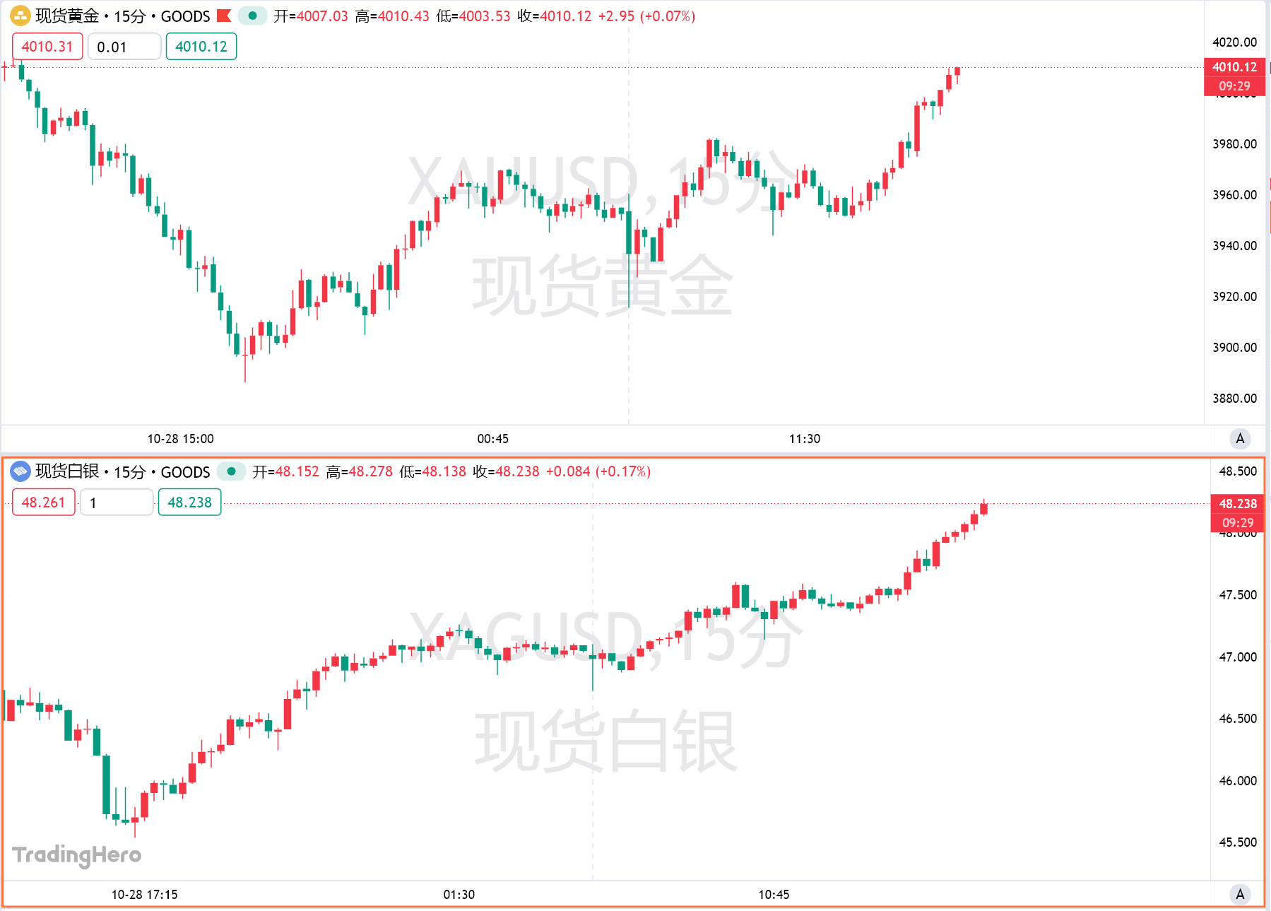 市场普遍预期美联储将降息25个基点,但美联储主席鲍威尔大概率不会提供过多前瞻性指引。对于不产生利息的贵金属而言,借贷成本下降通常会提升其吸 引力。 此前黄金曾经历一轮狂热涨势,上周创下每盎司4380美元以上的历史新高,随后便大幅回调。技术指标显示,此前涨势过猛、过快,而中美贸易谈判出现进 展信号,也导致避险需求下降,共同推动金价回落。 周三,外交部发言人宣布:经中美双方商定,国家主席习近平将于当地时间10月30日在韩国釜山同特朗普举行会晤,就中美关系和双方共同关心的问题交换 意见。 特朗普对此次峰会前景表示乐观,他向记者表示,预计会面将"为美国乃至全球带来非常好的结果"。 尽管近期金价回调,今年以来黄金仍累计上涨约50%。这一涨势得益于各国央行购金,以及所谓的"贬值交易"——投资者为规避失控的预算赤字,选择避开 主权债务与货币,转而配置黄金。 在经历三日的抛售后,黄金价格迎来反弹。现货黄金周三欧盘重新站上4010美元/盎司,日内涨幅接近1.5%。现货白银收复48美元/盎司关口,日内涨约 2.5%。在美联储预计降息的背景下,抄底资金开始回流市场。 "尽管短期狂热明显让位于盘整,但黄金作为对冲财政与政策不确定性的 ...