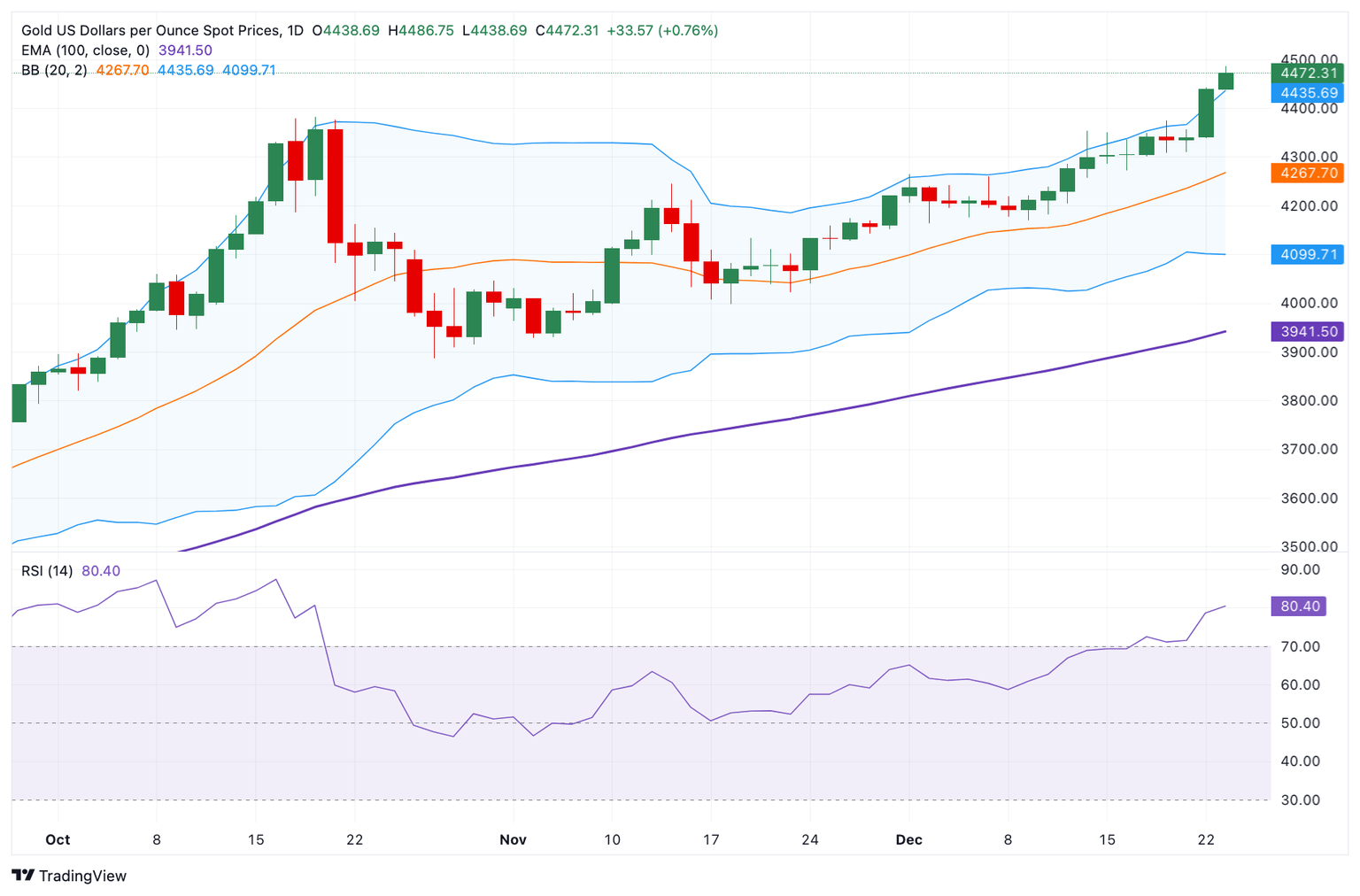 美联储进一步降息的前景和地缘政治担忧提振了避险资金流,从而推高了金价。 周二将公布的美国第三季度GDP初值报告备受关注。 周二欧洲早盘交易时段,黄金价格(XAU/USD)攀升至历史新高。过去一个月,这种贵金属价格上涨了10%,2025年以来累计上涨近70%,原因是地缘政 治紧张局势加剧和经济不确定性增强,提振了对黄金等避险资产的需求。 此外,市场预期美联储明年将进一步降息,这也可能支撑金价。较低的利率可以降低持有黄金的机会成本,从而支撑这种不产生收益的贵金属。鉴于通胀放 缓和就业增长乏力的迹象,市场预计美联储将在2026年多次降息。 交易员正在等待周二晚些时候公布的美国第三季度国内生产总值(GDP)初值报告。预计美国第三季度经济将以3.2%的年化速度增长,低于第二季度3.8% 的增速。如果GDP报告结果强于预期,可能会提振美元,并在短期内对以美元计价的大宗商品价格构成压力。此外,美国耐用品订单、工业生产和ADP就业 周度数据也将于同日公布。 市场动态:地缘政治紧张局势升级,市场押注美联储将进一步降息,黄金价格飙升 周二欧洲早盘,金价升至历史新高。 美联储理事斯蒂芬·米兰周一表示,他可能会在任期届满后继续留在美 ...