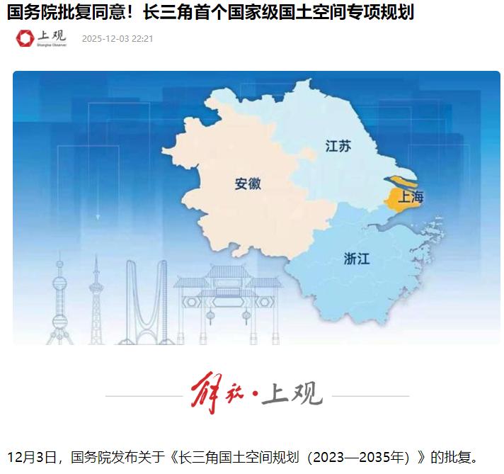 01 长三角首份国土空间规划,批复了 12月3日,国务 院批复了《长三角国土空间规划(2023—2035年)》。 这是长三角首份,也是全国第三个获批的国家级城市群国土空间规划。 之所以是首份,是因为在本轮批复之前,国土空间规划还不叫国土空间规划,而是由主体功能区规划、土地利用规划、城乡规划等多份文件共同呈现。 现在采取了多规合一,也即所有的规划都浓缩到了国土空间规划当中。 随着"十四五"即将收官,去年以来各省市自治区以及主要城市的国土空间规划,相继获得国务院批复。 今年则是国家级城市群的国土空间规划进入批复阶段。京津冀、成渝地区双城经济圈已分别在1月份、11月份获批,下一个该轮到粤港澳。 具体来看 《长三角国土空间规划(2023—2035年)》,国家给到的定位是: 落实长三角一体化发展战略部署,建设世界级城市群,支撑长三角在中国式 现代化中走在前列,更好发挥先行探路、引领示范、辐射带动作用。 作为全国经济规模最大的国家级城市圈,长三角城市群的定位一出场便是世界级。 自2019年安徽全境加入长三角大家族后,长三角城市圈涵盖三省一市,覆盖41个城市,坐拥上海、苏州、杭州、南京、宁波、无锡、合肥、南通、常州9 个万 ...